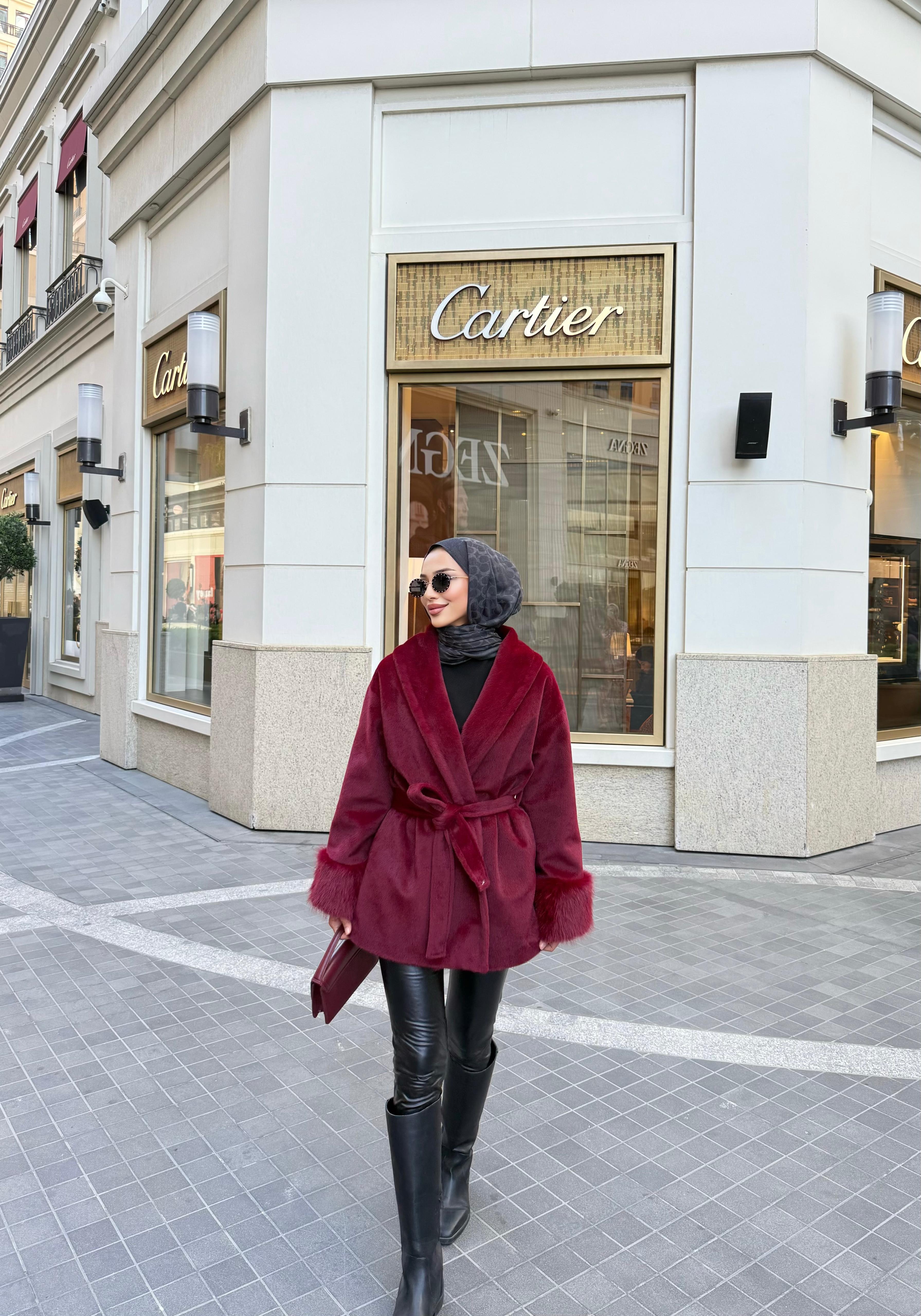 MT0169H&R ButikBereket Kürk Detaylı Kaşe Mont Bordo