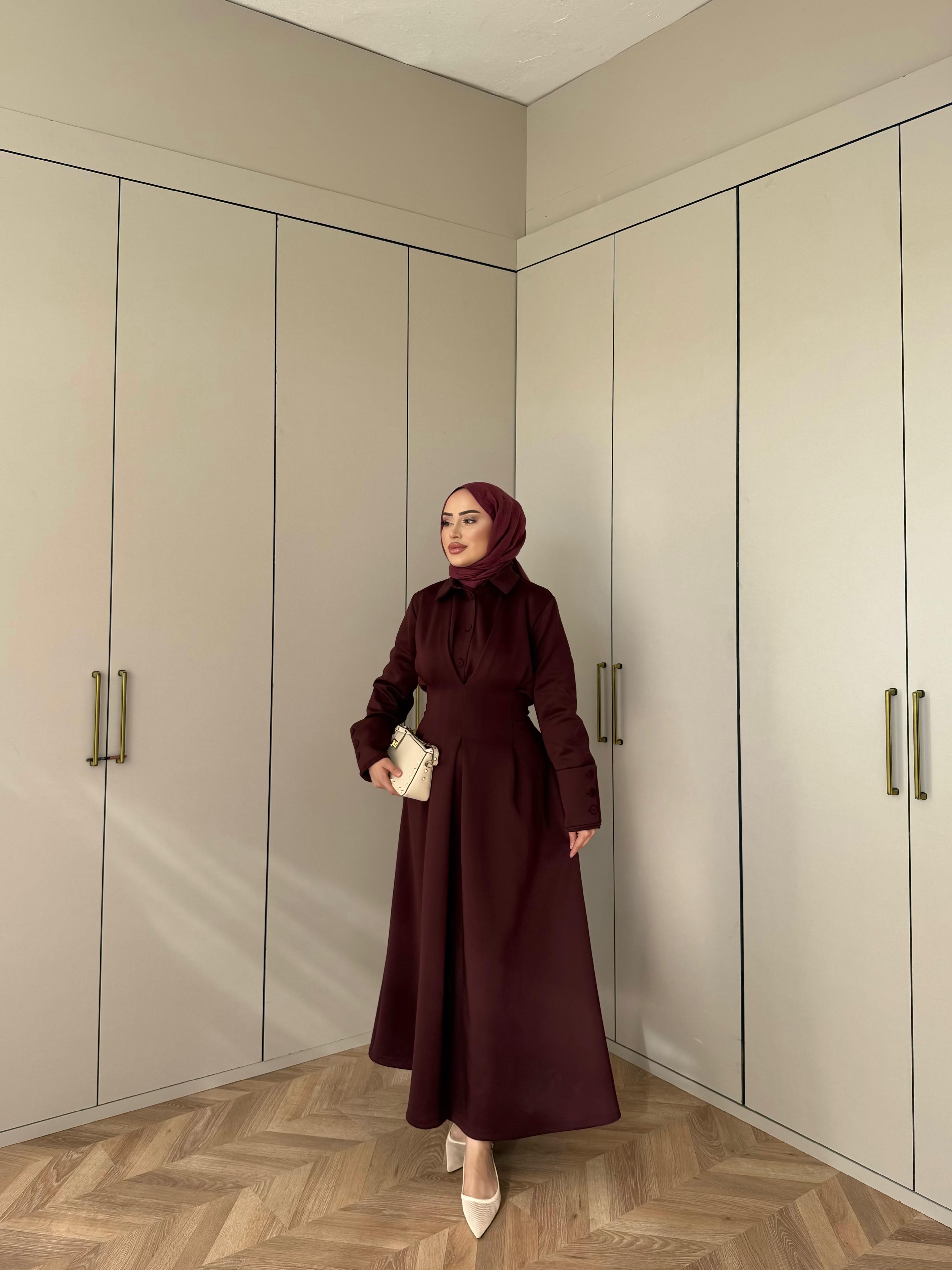 ELBS-011H&R ButikDüğme Detaylı Scuba Elbise Bordo