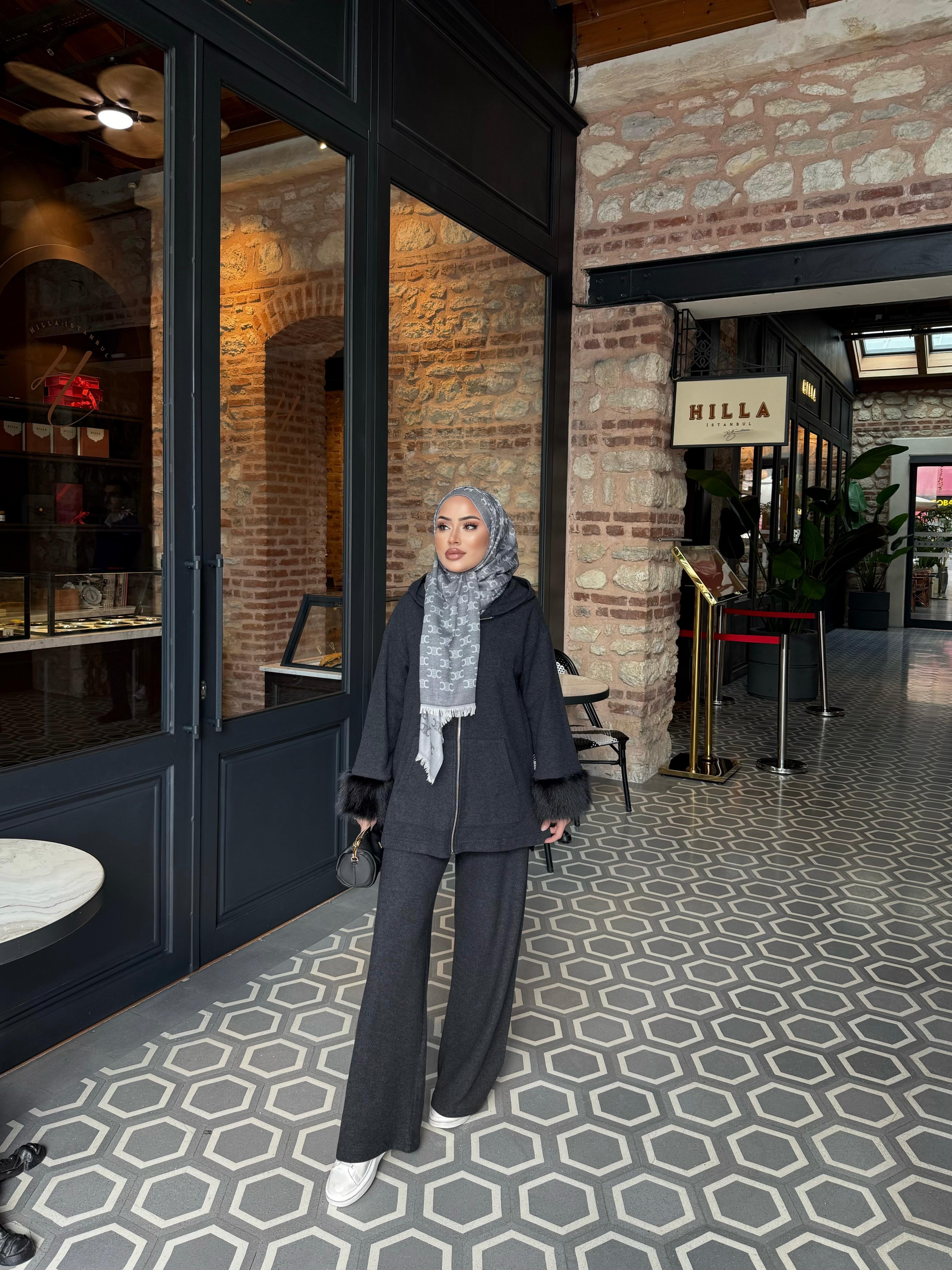 TAKM-1848H&R ButikElo Kolu Kürklü Takım Antrasit