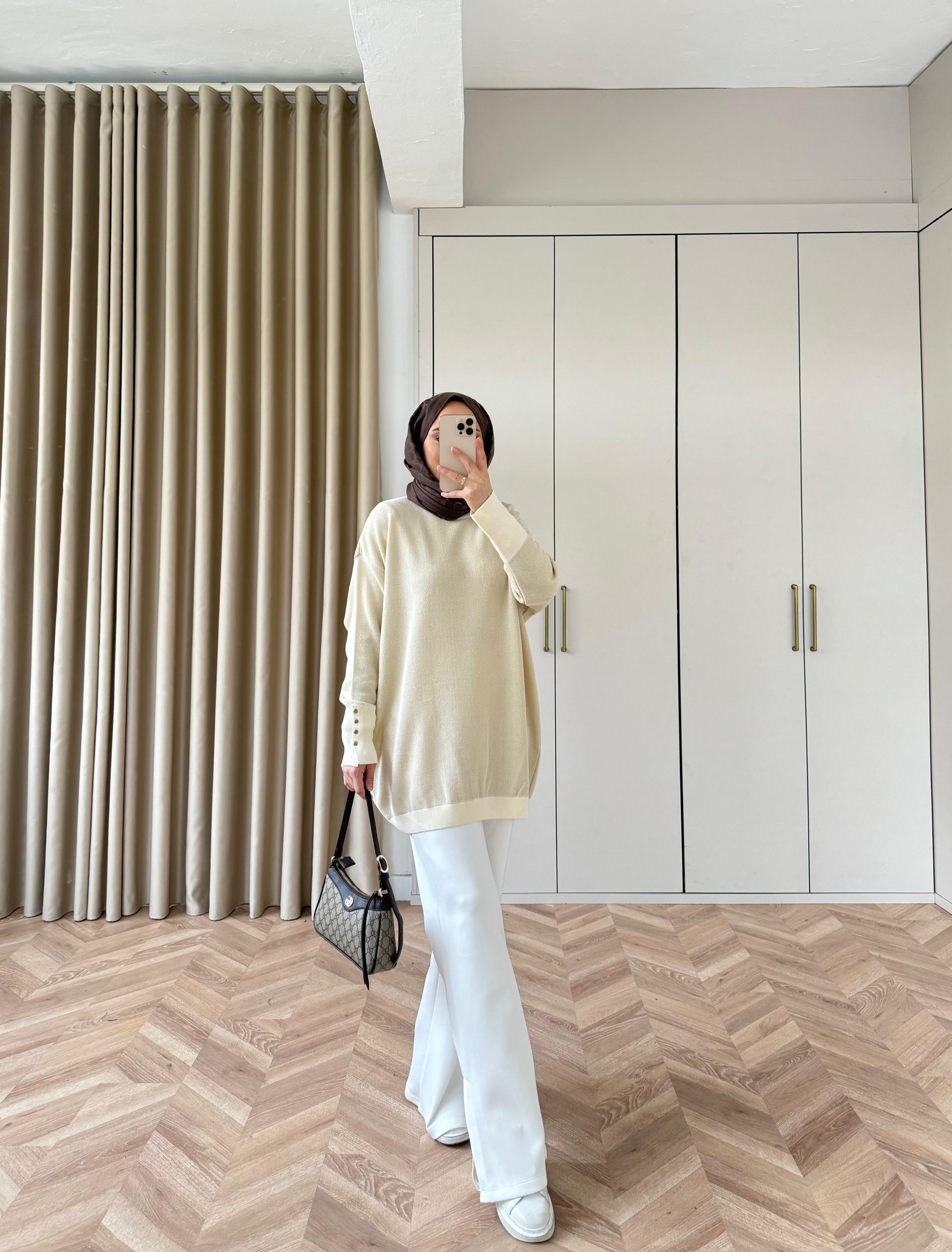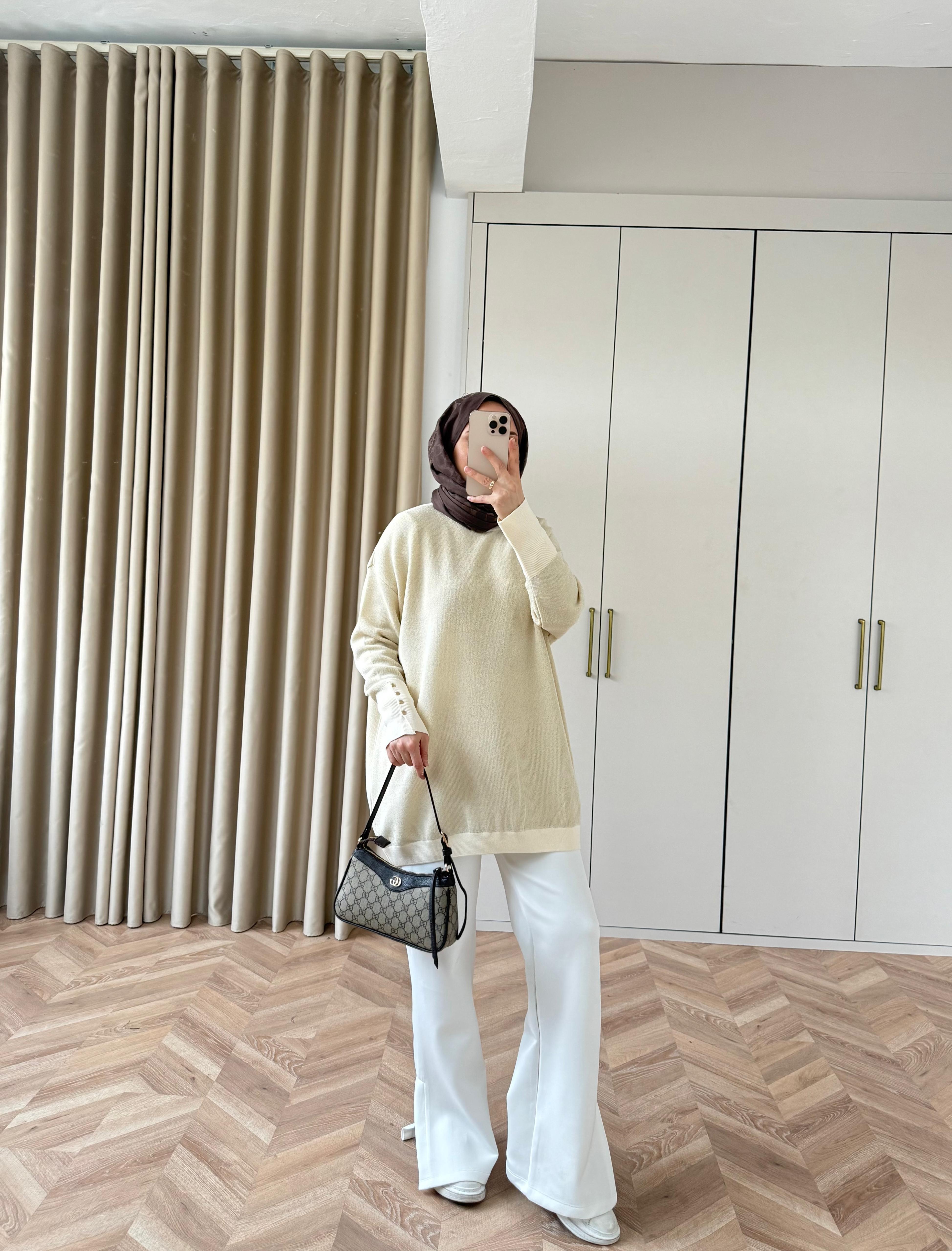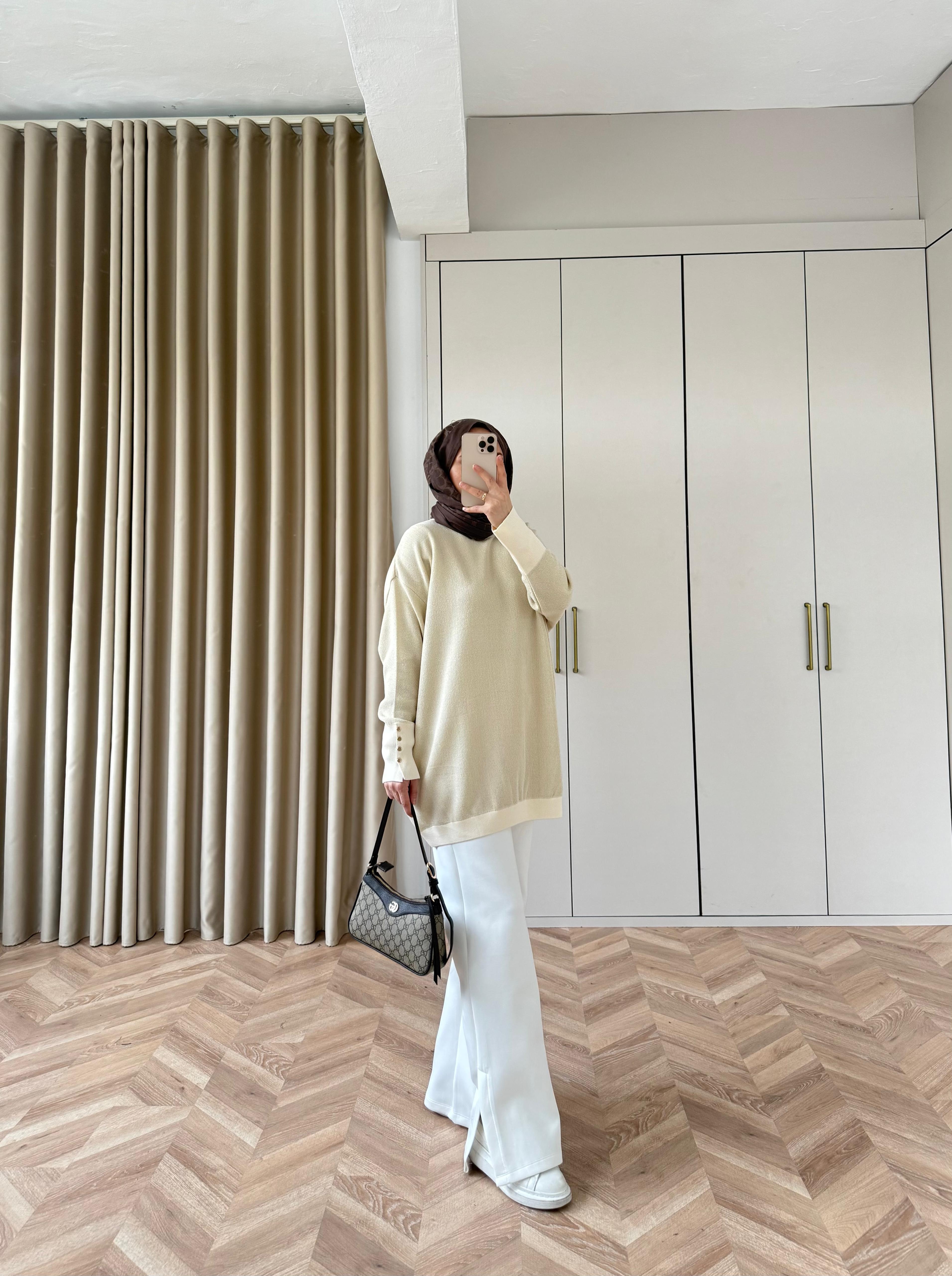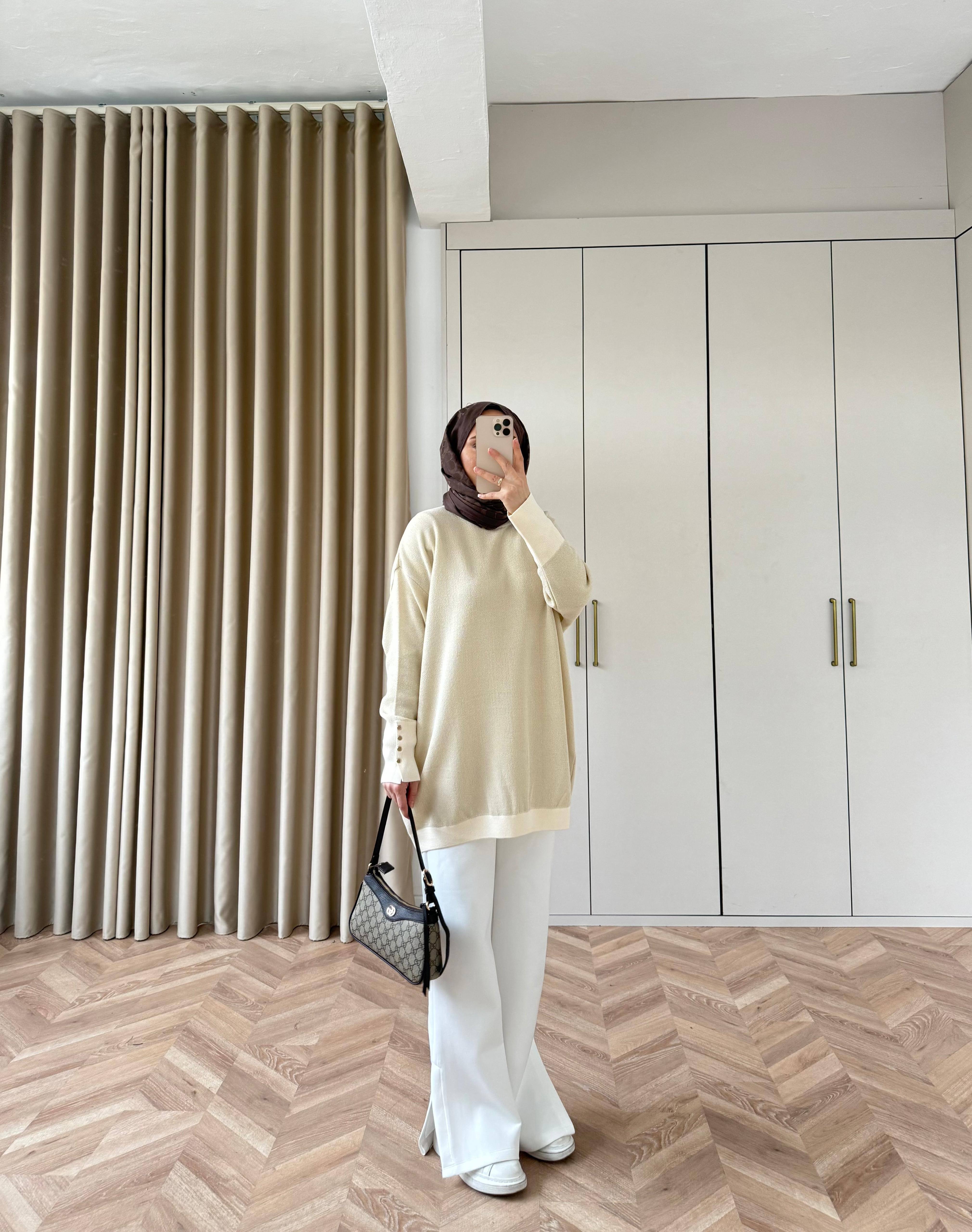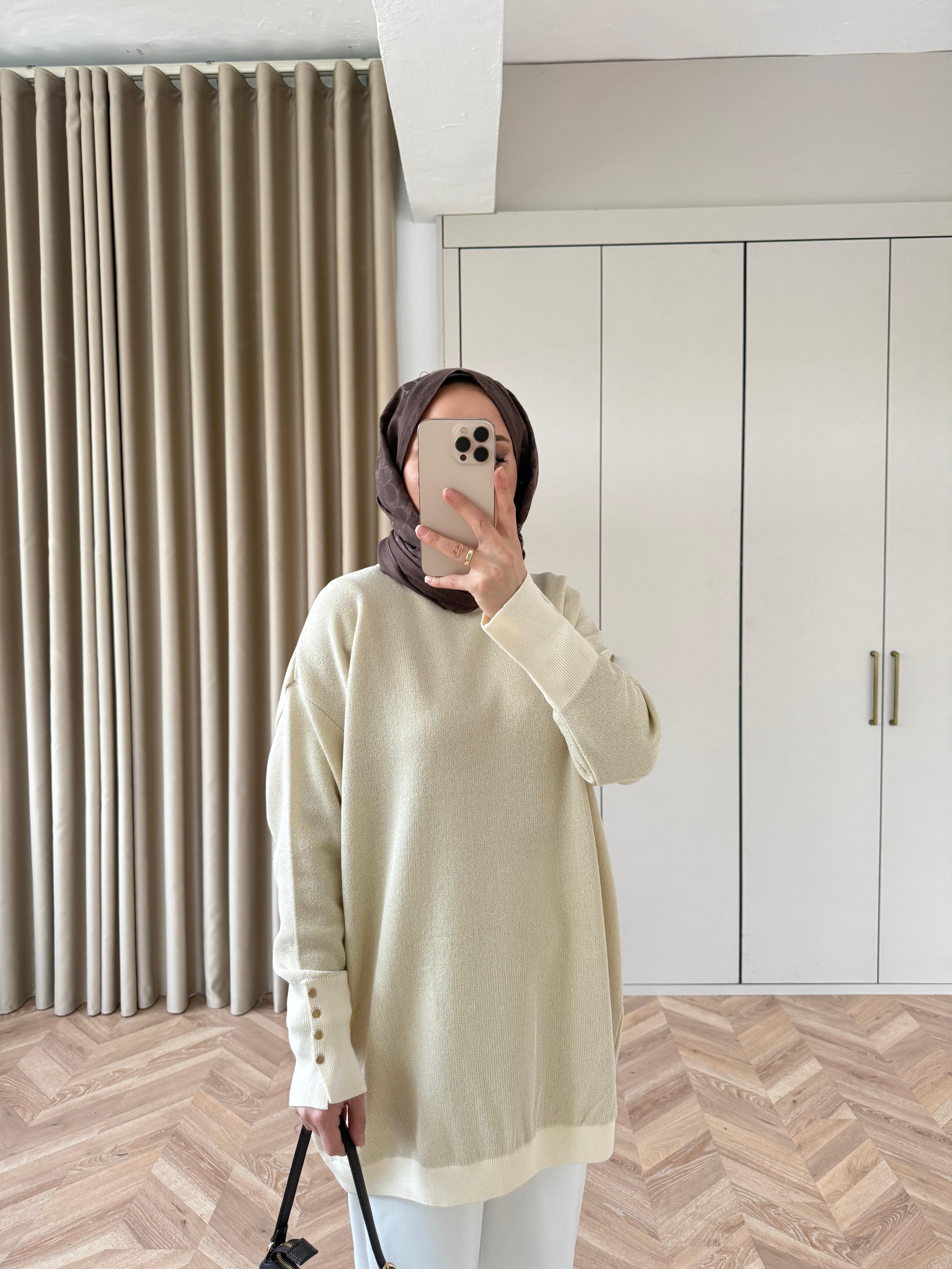 Esan Simli Kolu Düğmeli Triko Kazak Bej