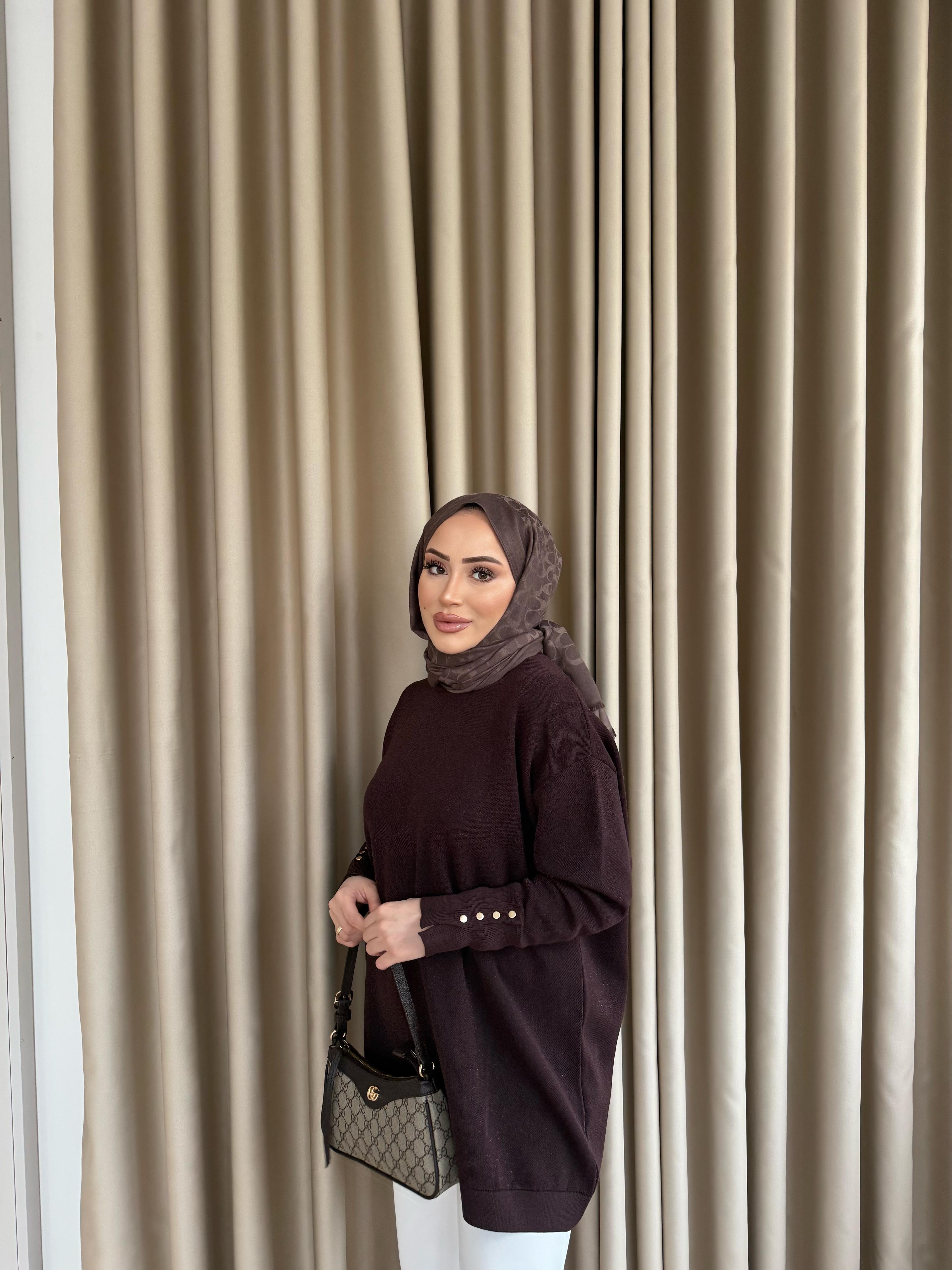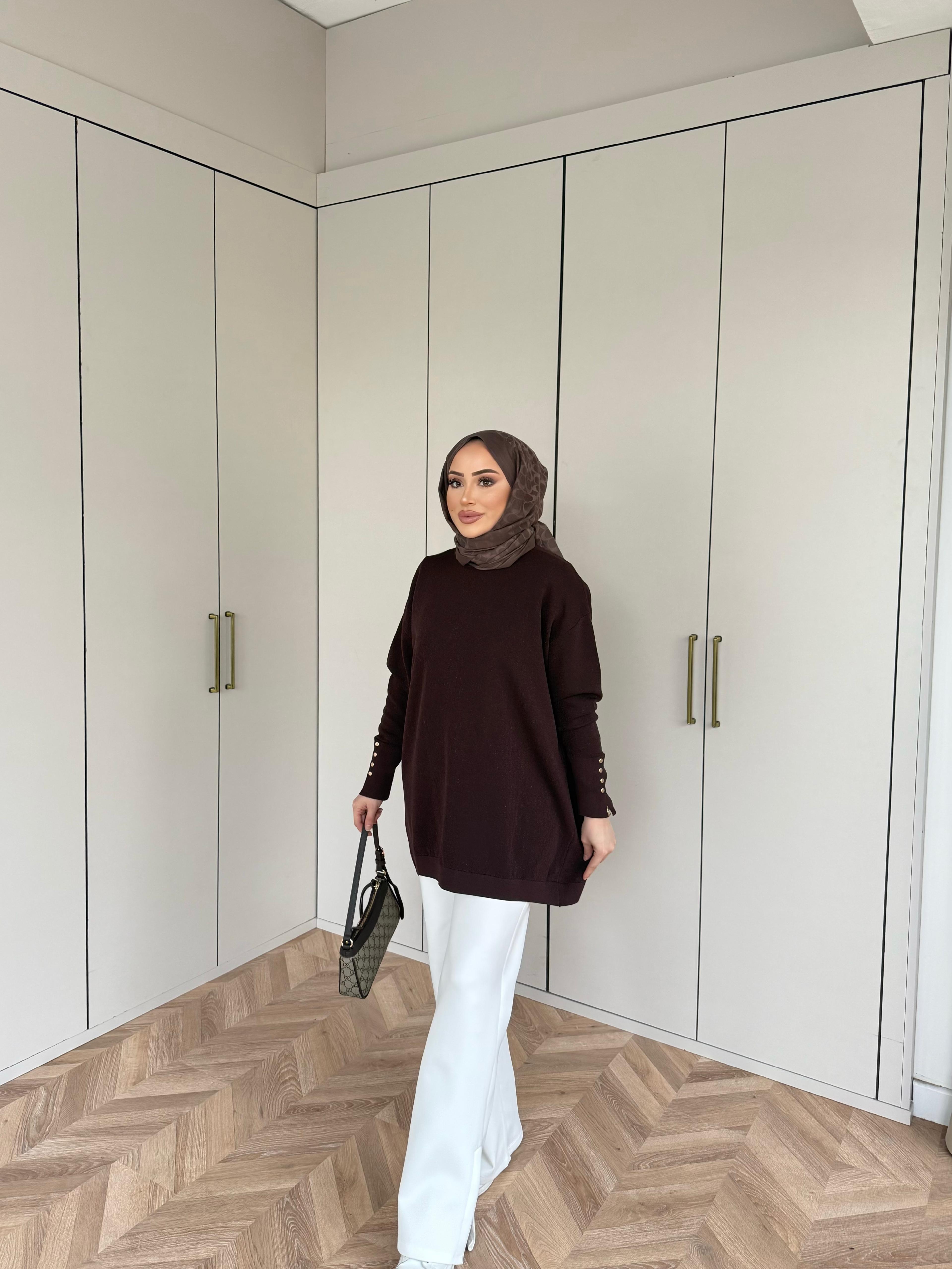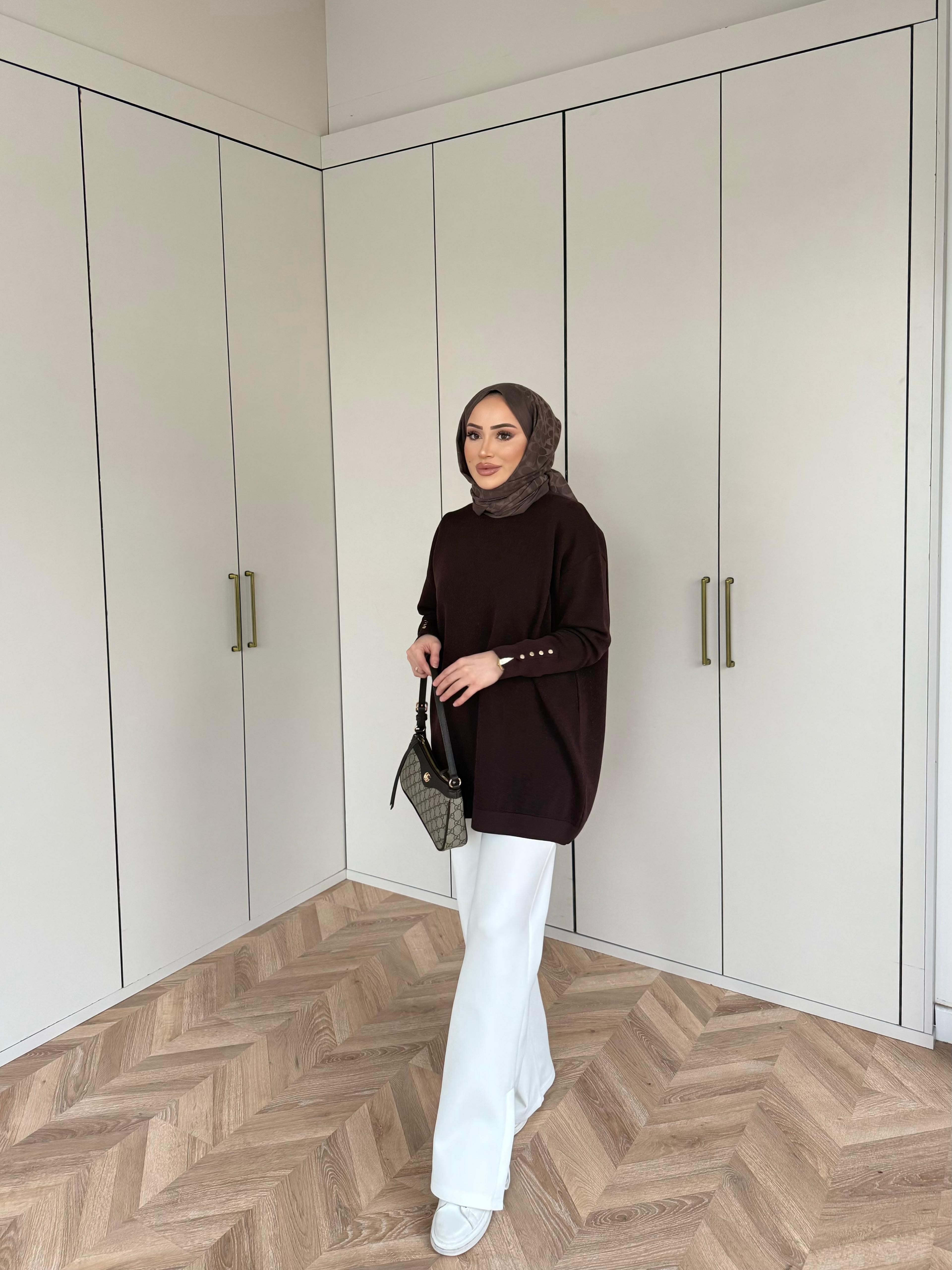 Esan Simli Kolu Düğmeli Triko Kazak Kahverengi