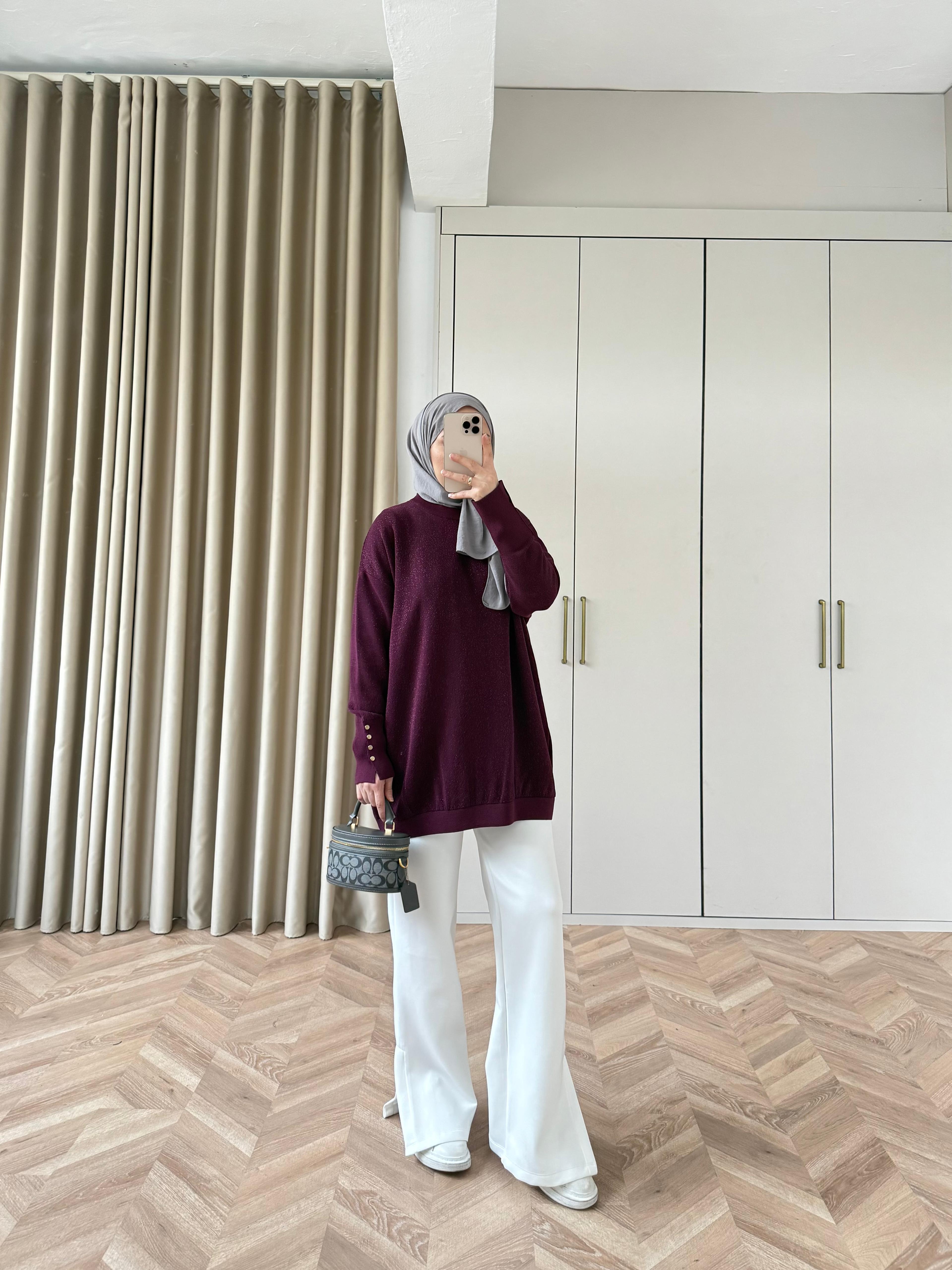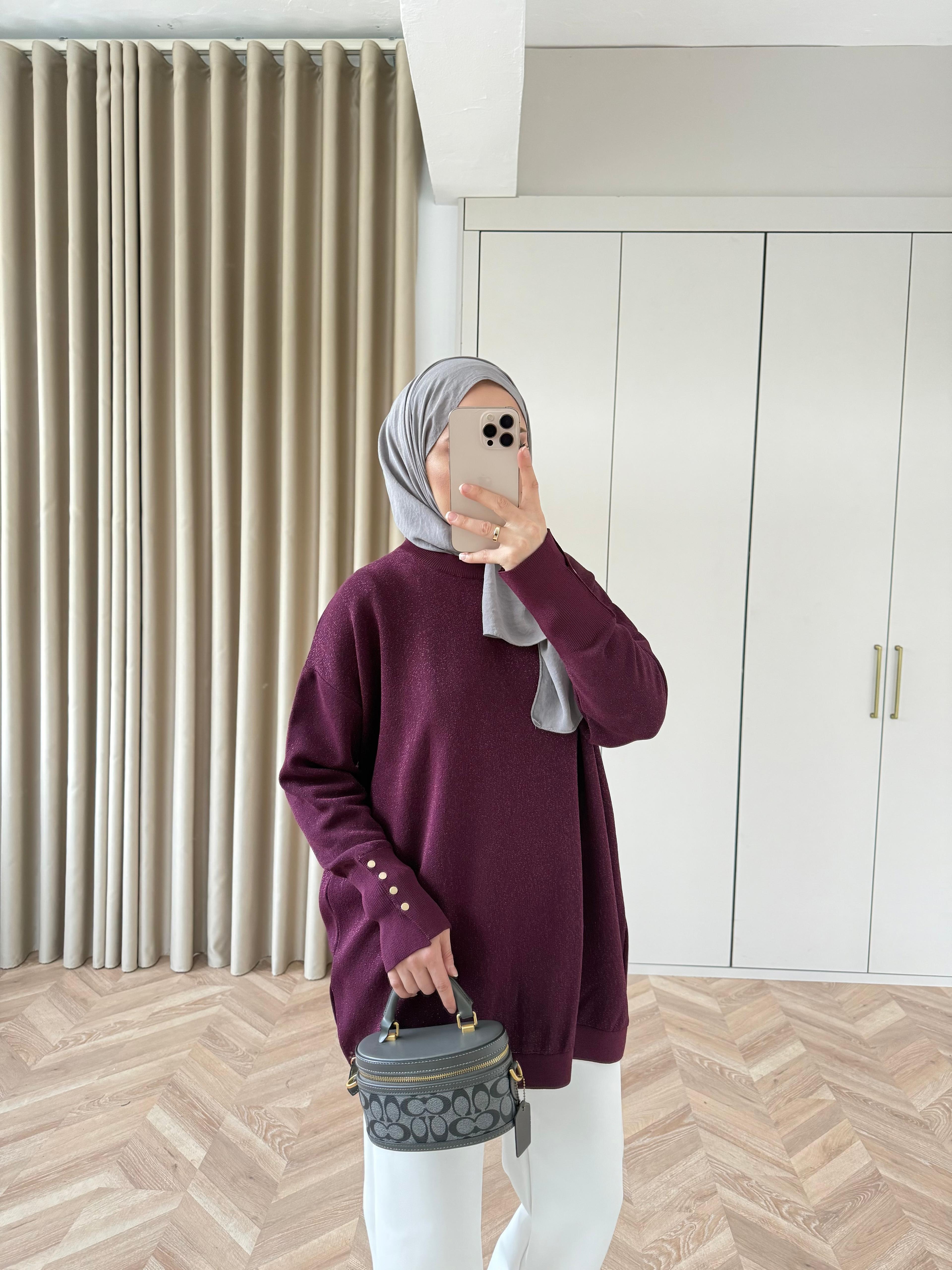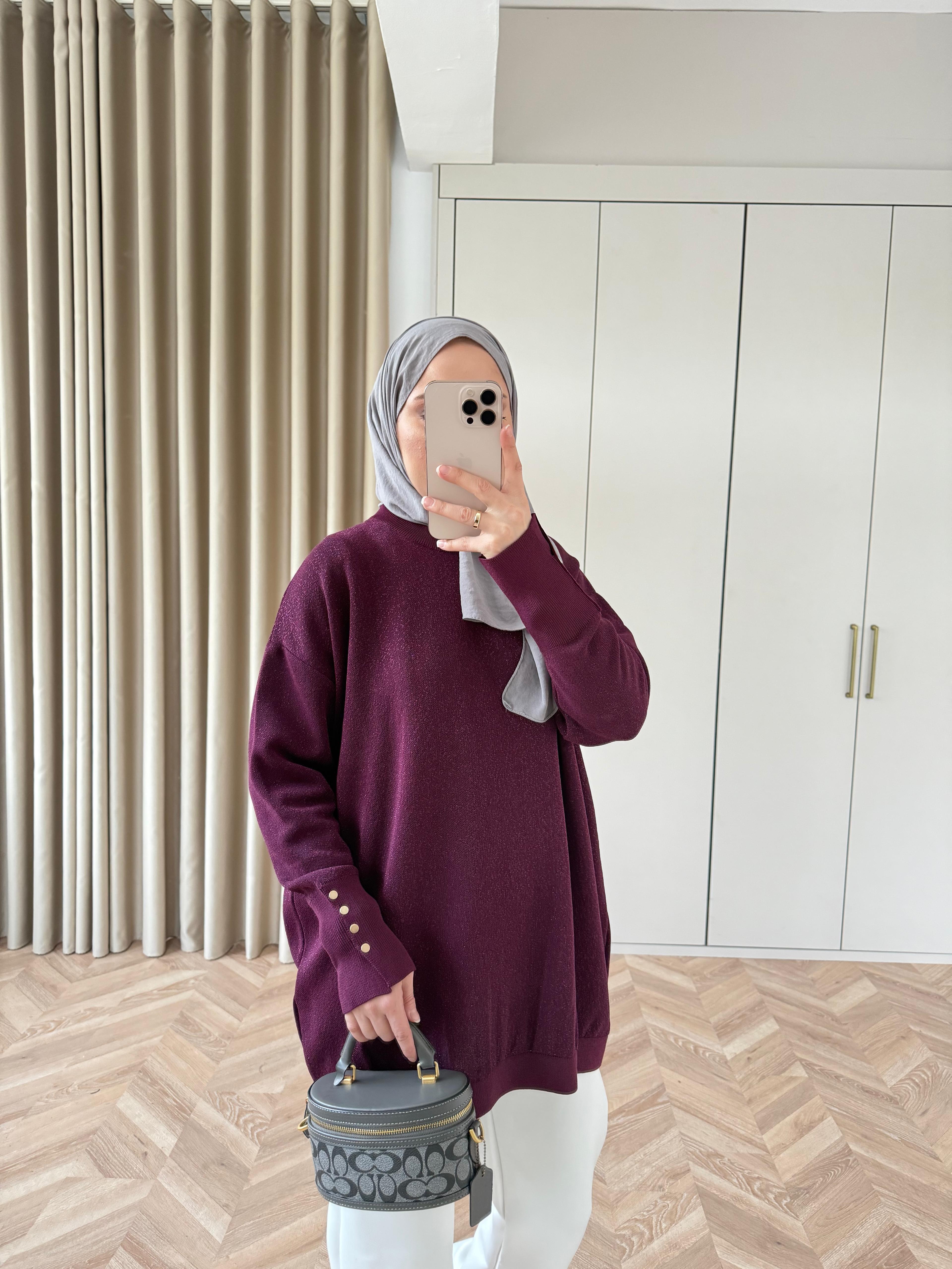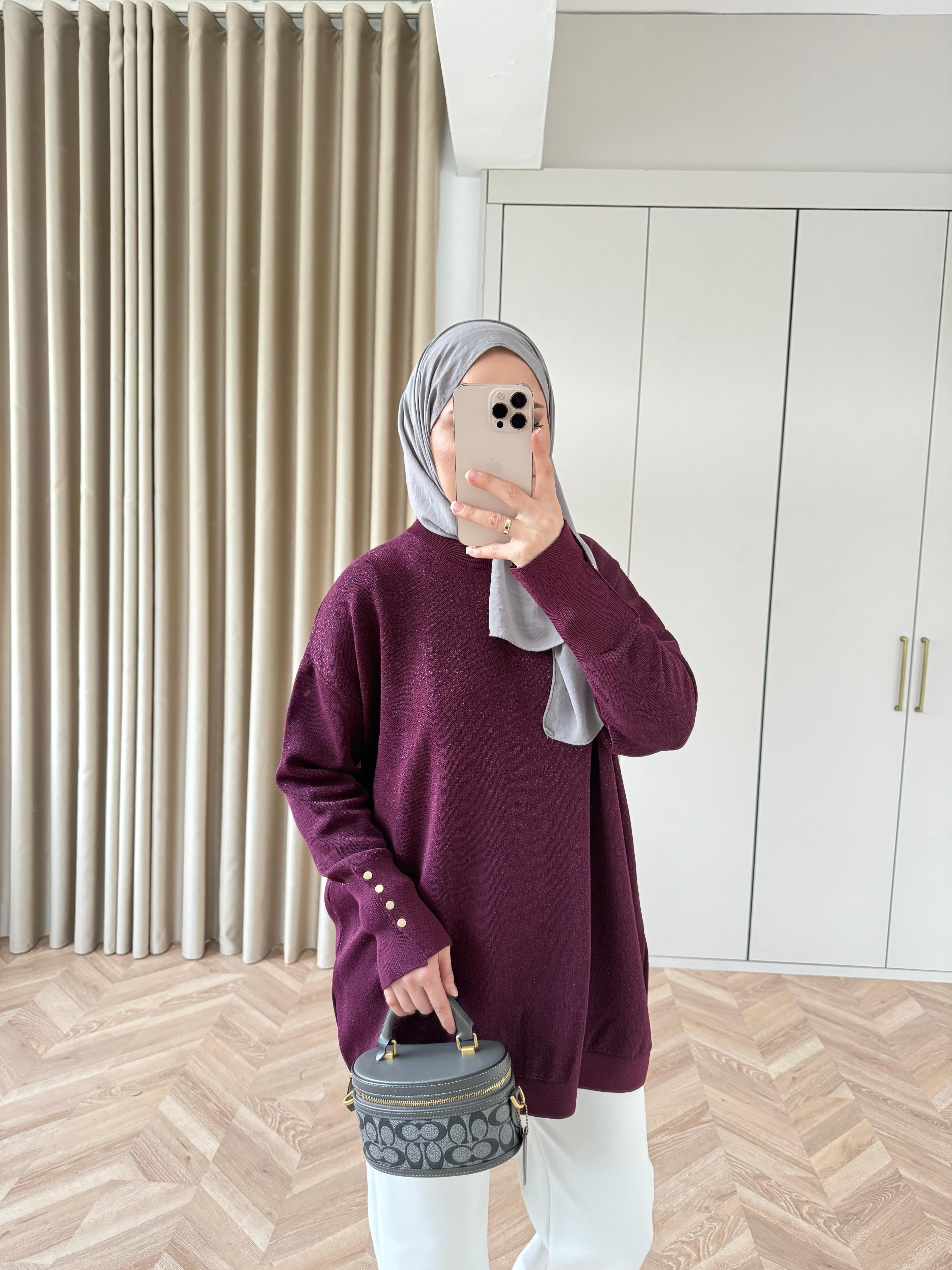Esan Simli Kolu Düğmeli Triko Kazak Mürdüm