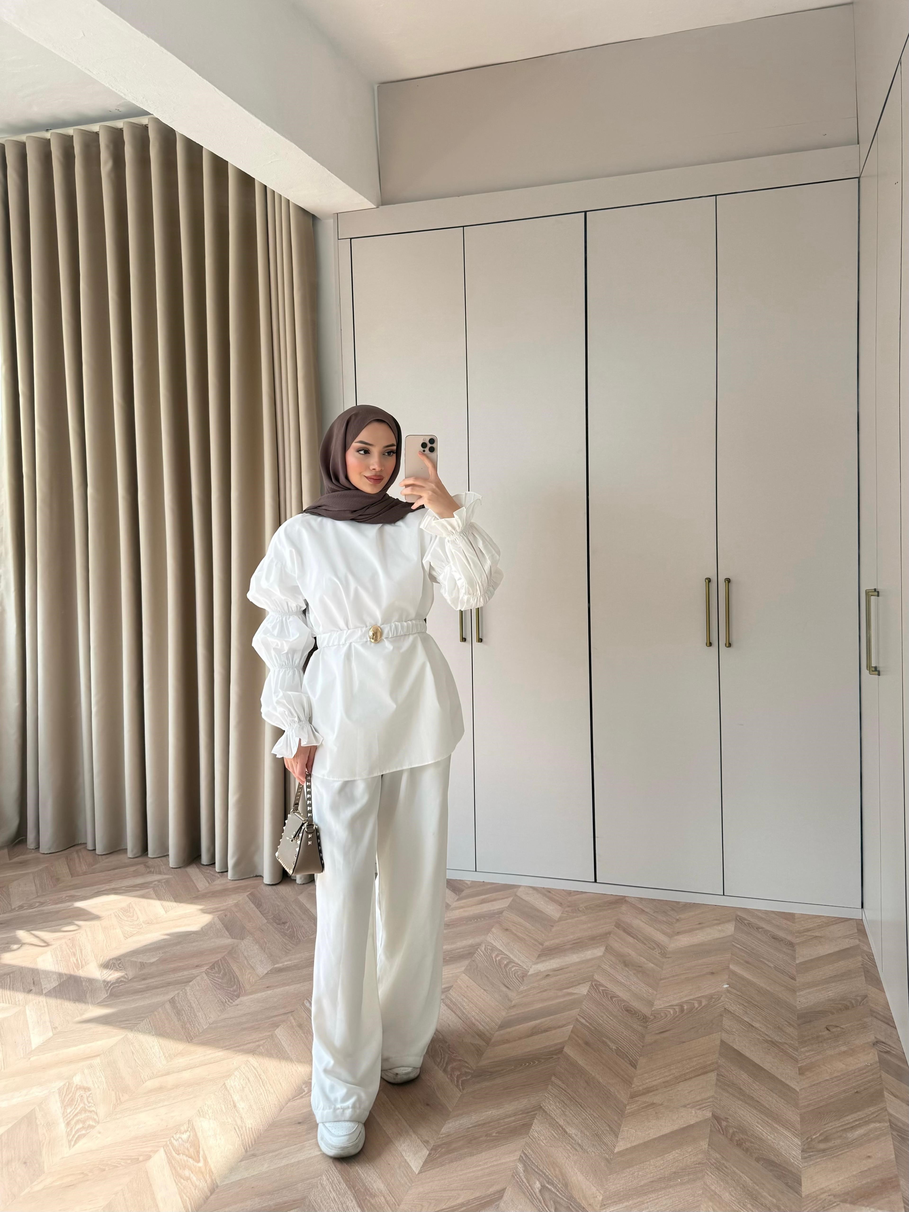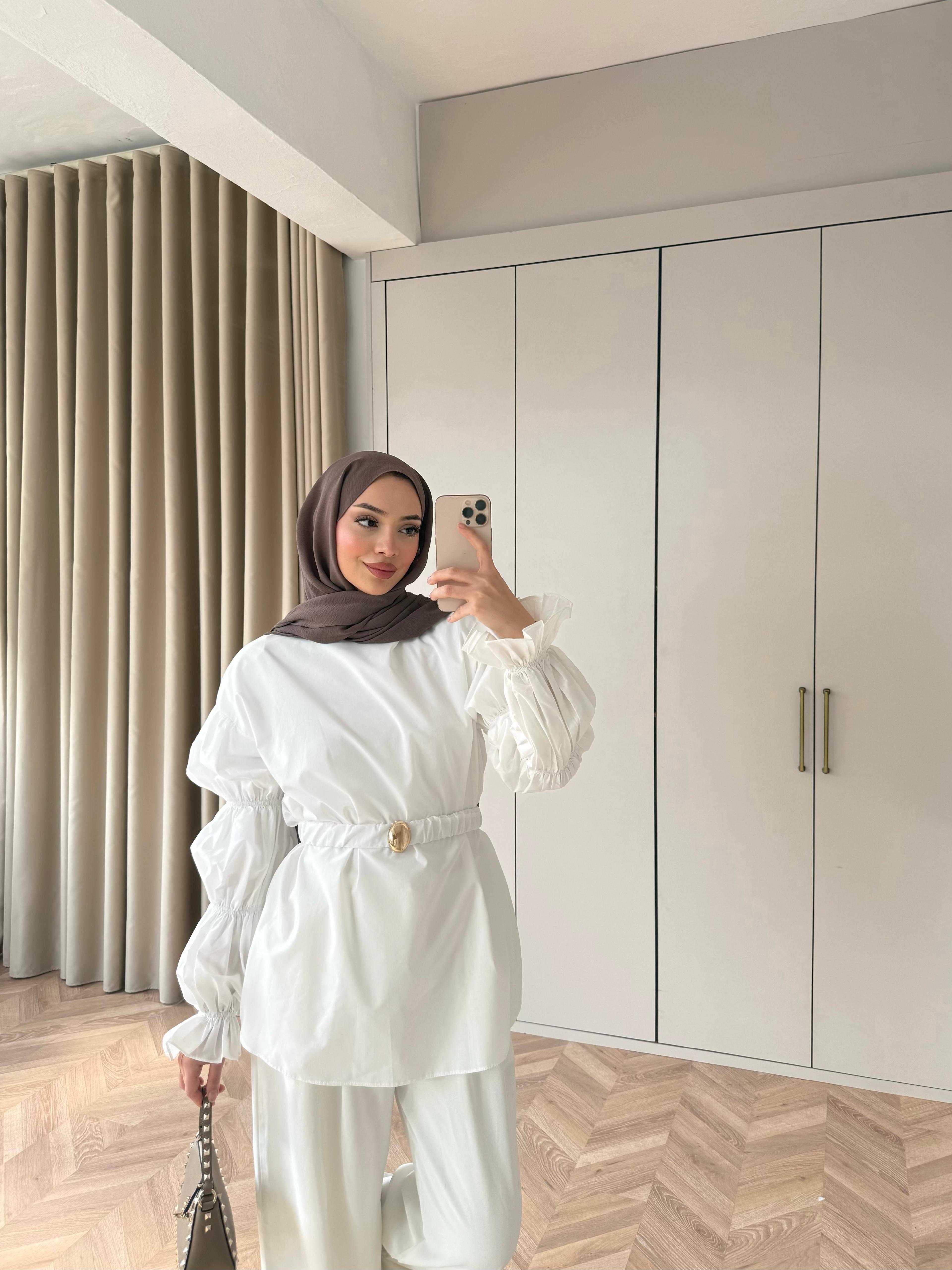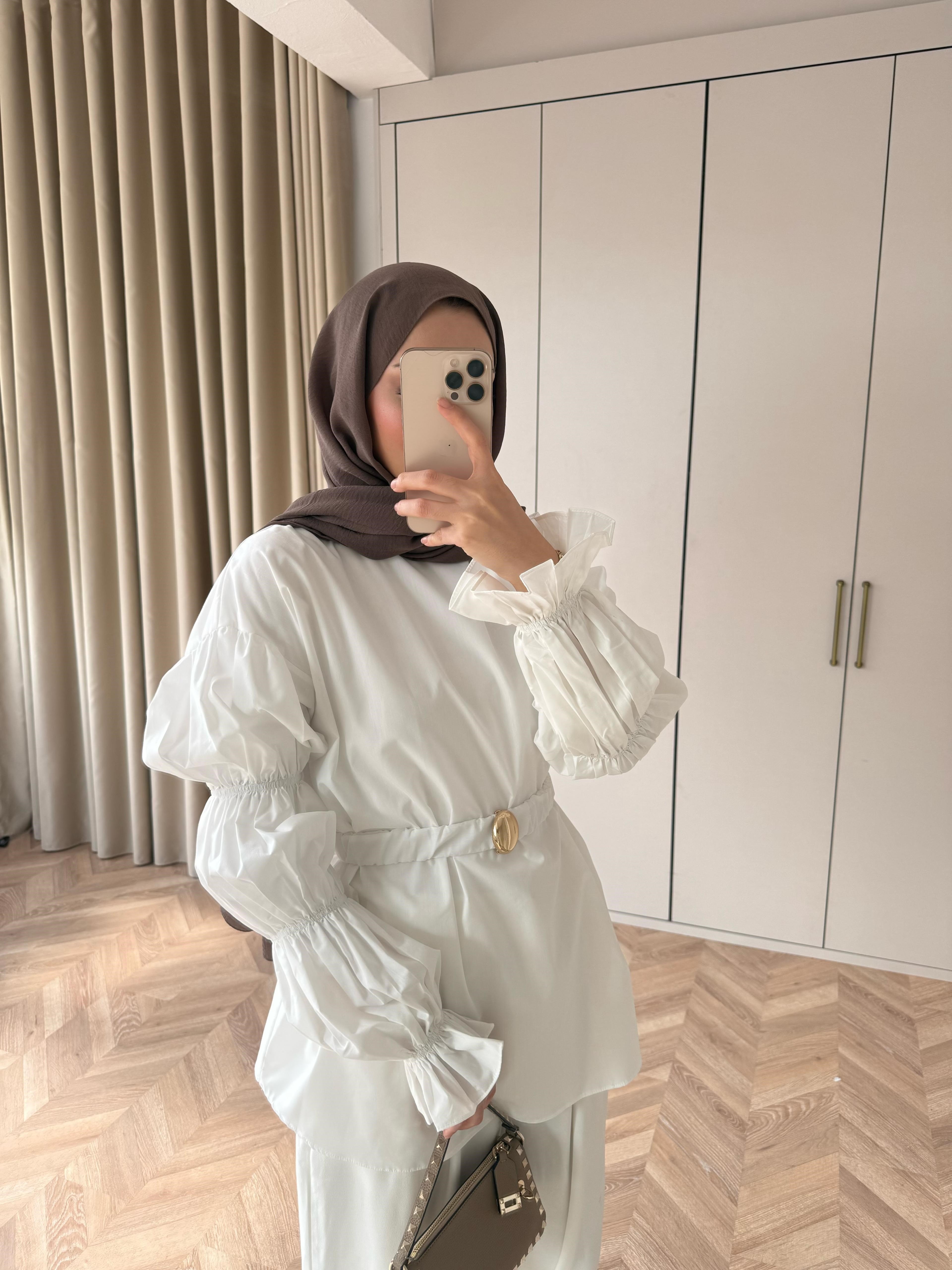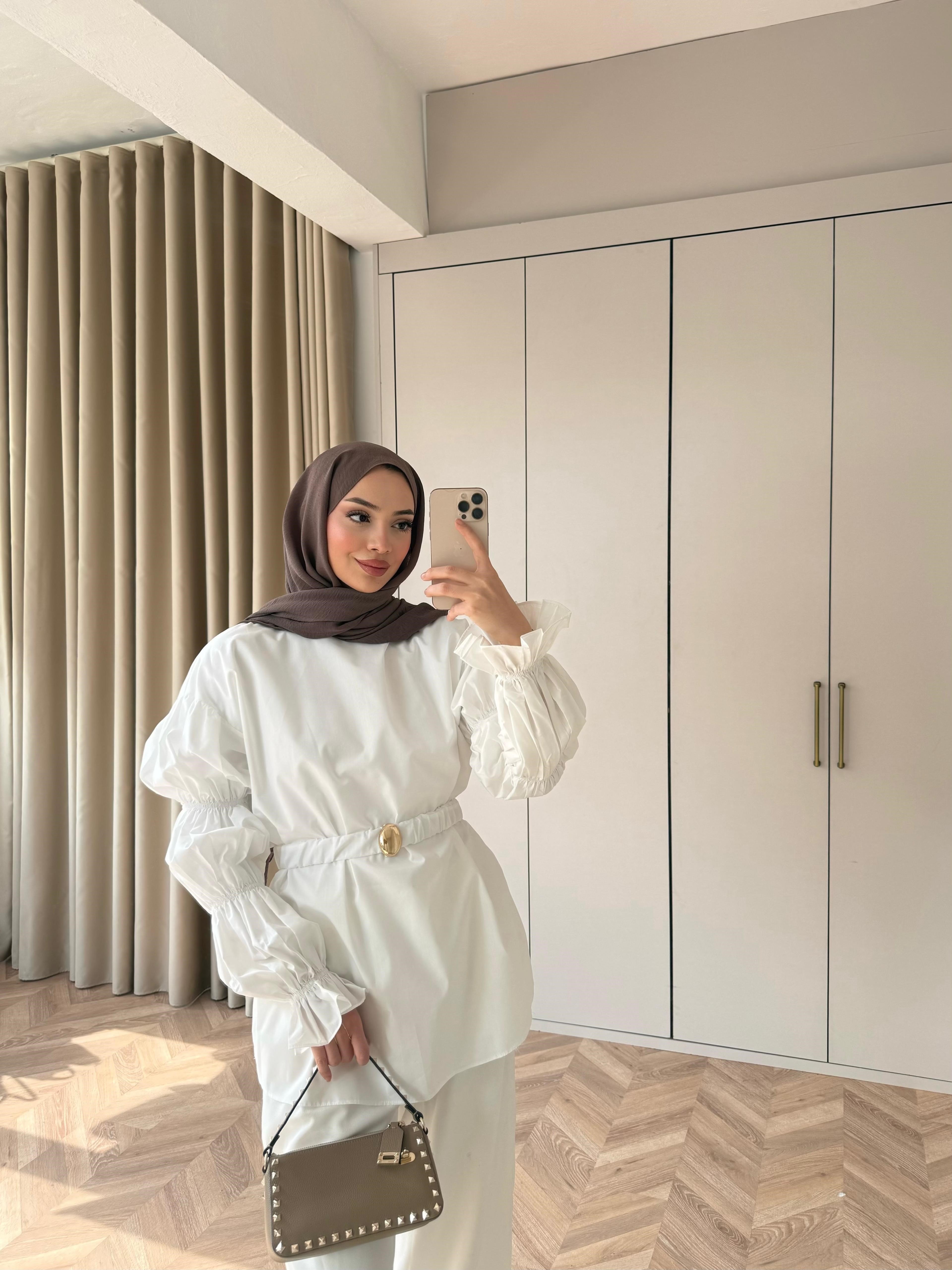 Hen81289-Elas Kolu Katkat Gömlek Beyaz