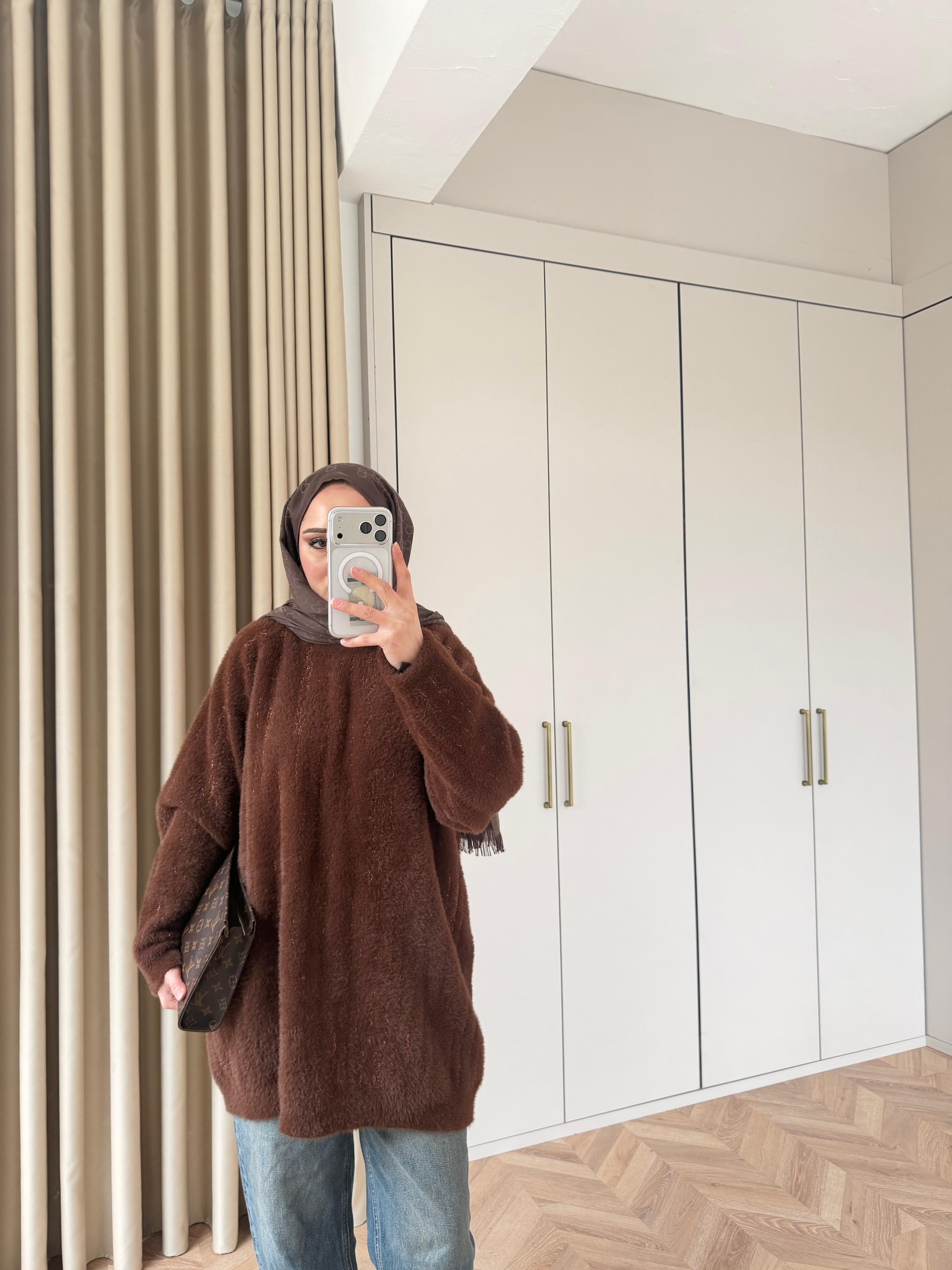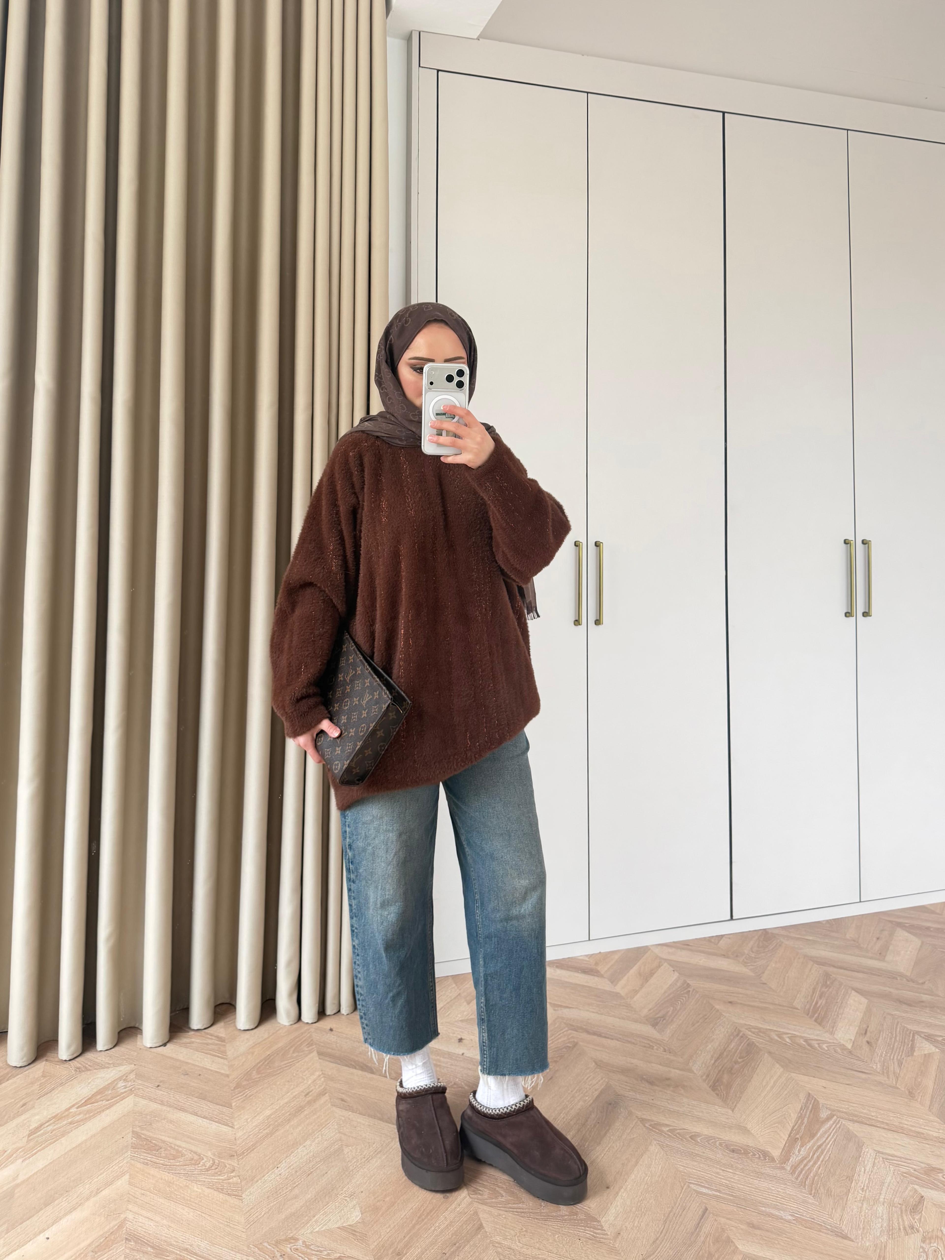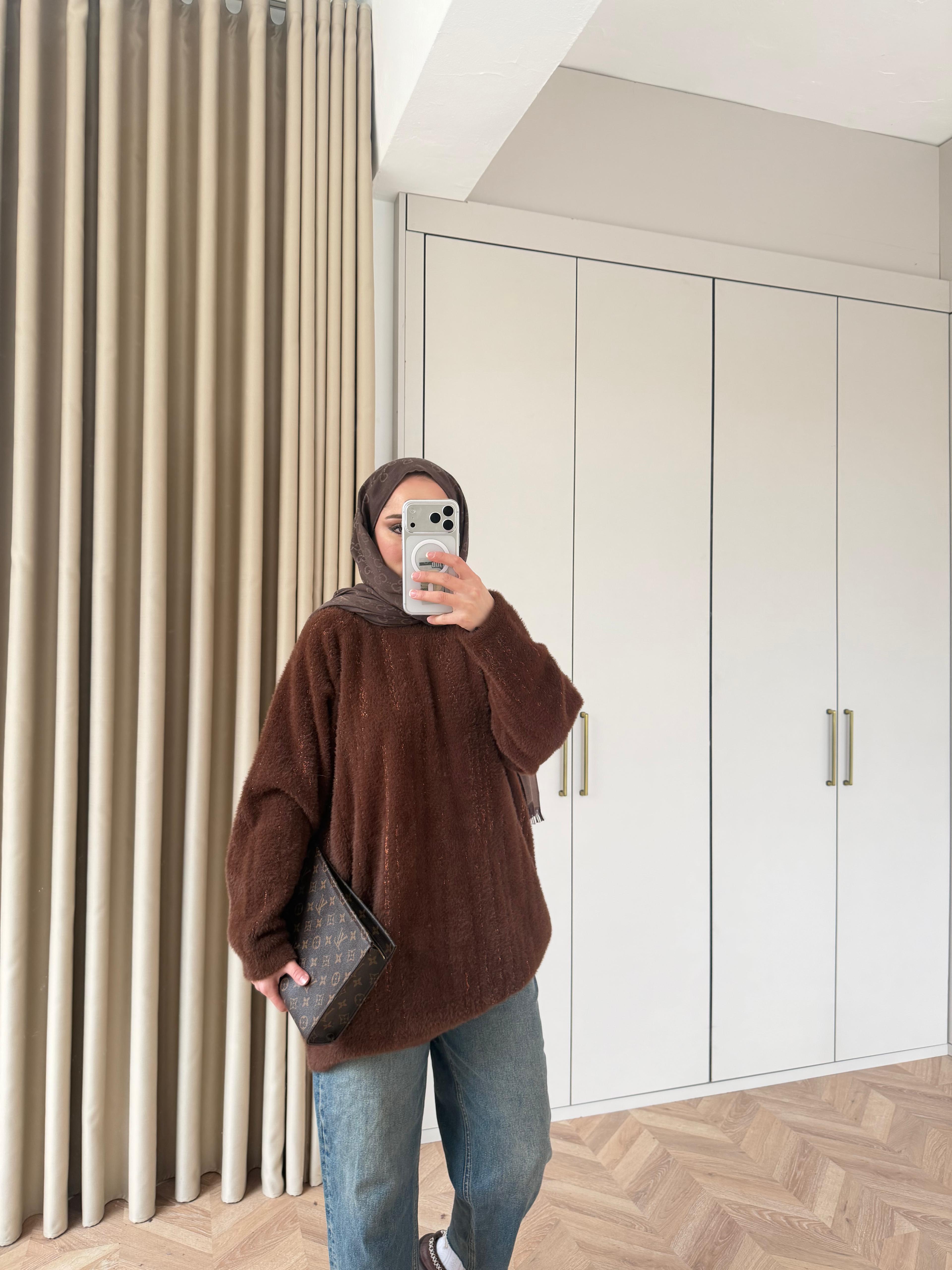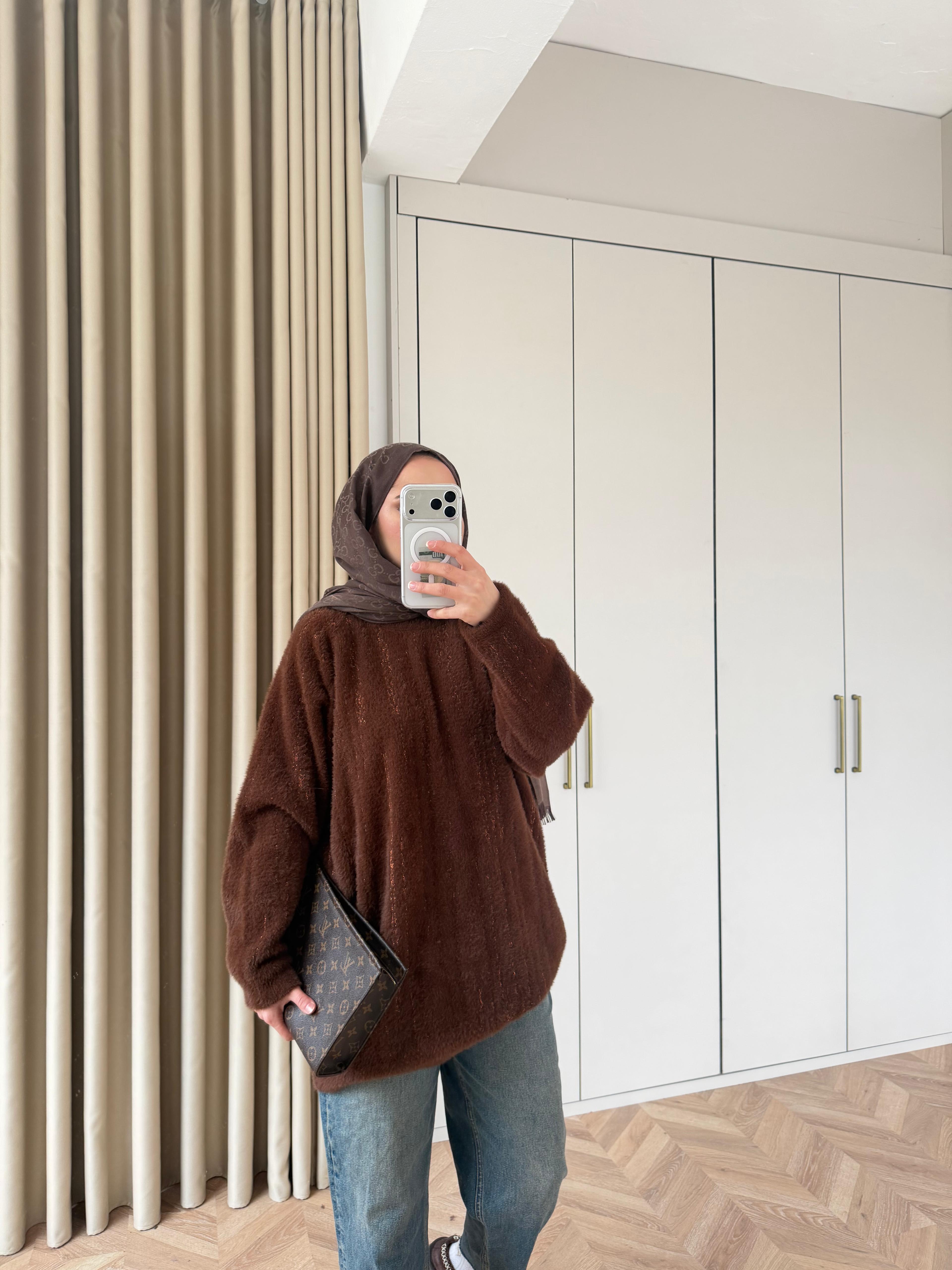 İçinde Parlak Sim Geçmeli Angora Kazak Kahve