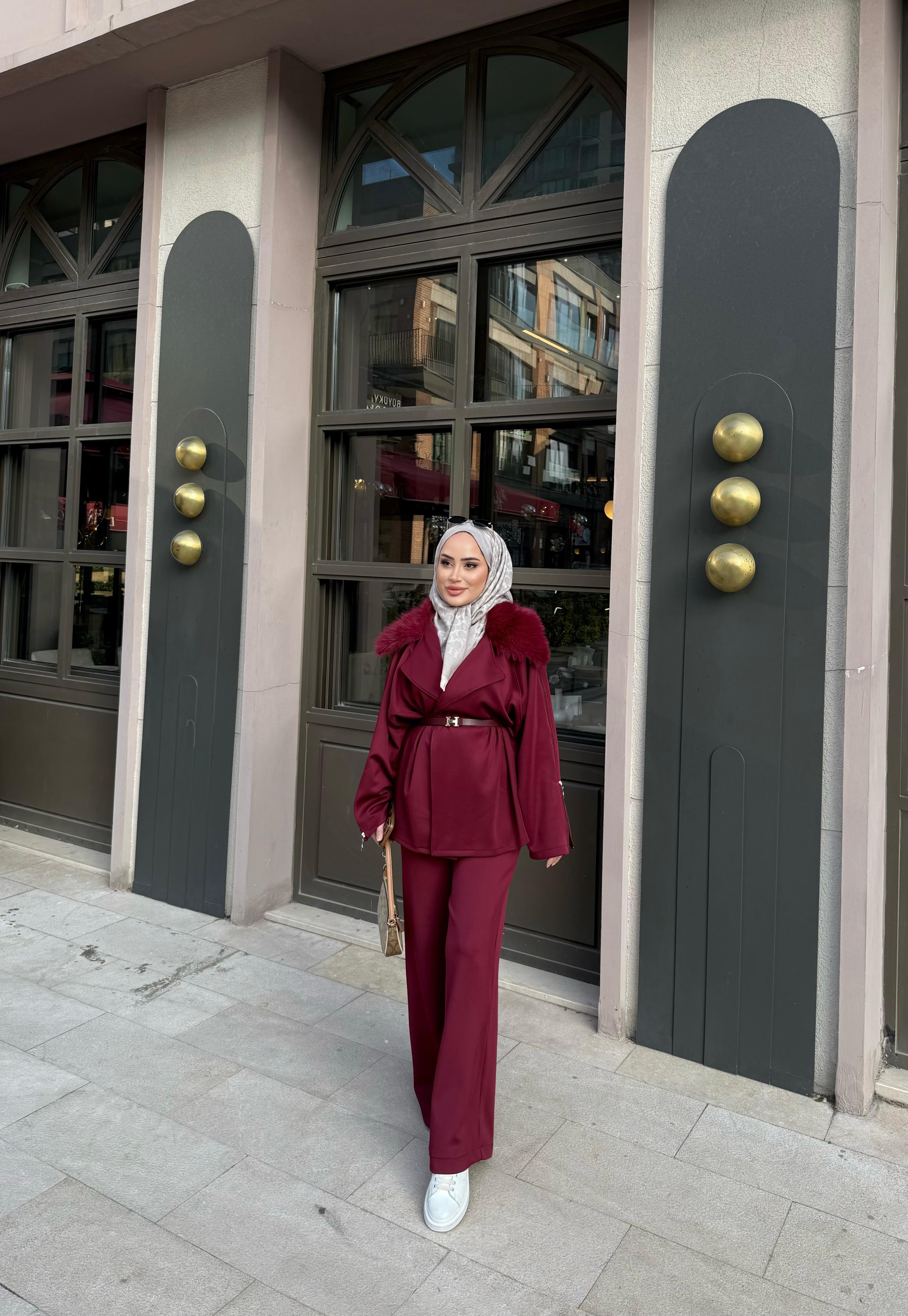 TAKM-1760H&R ButikJoan Kürk Detaylı Scuba Takım Bordo