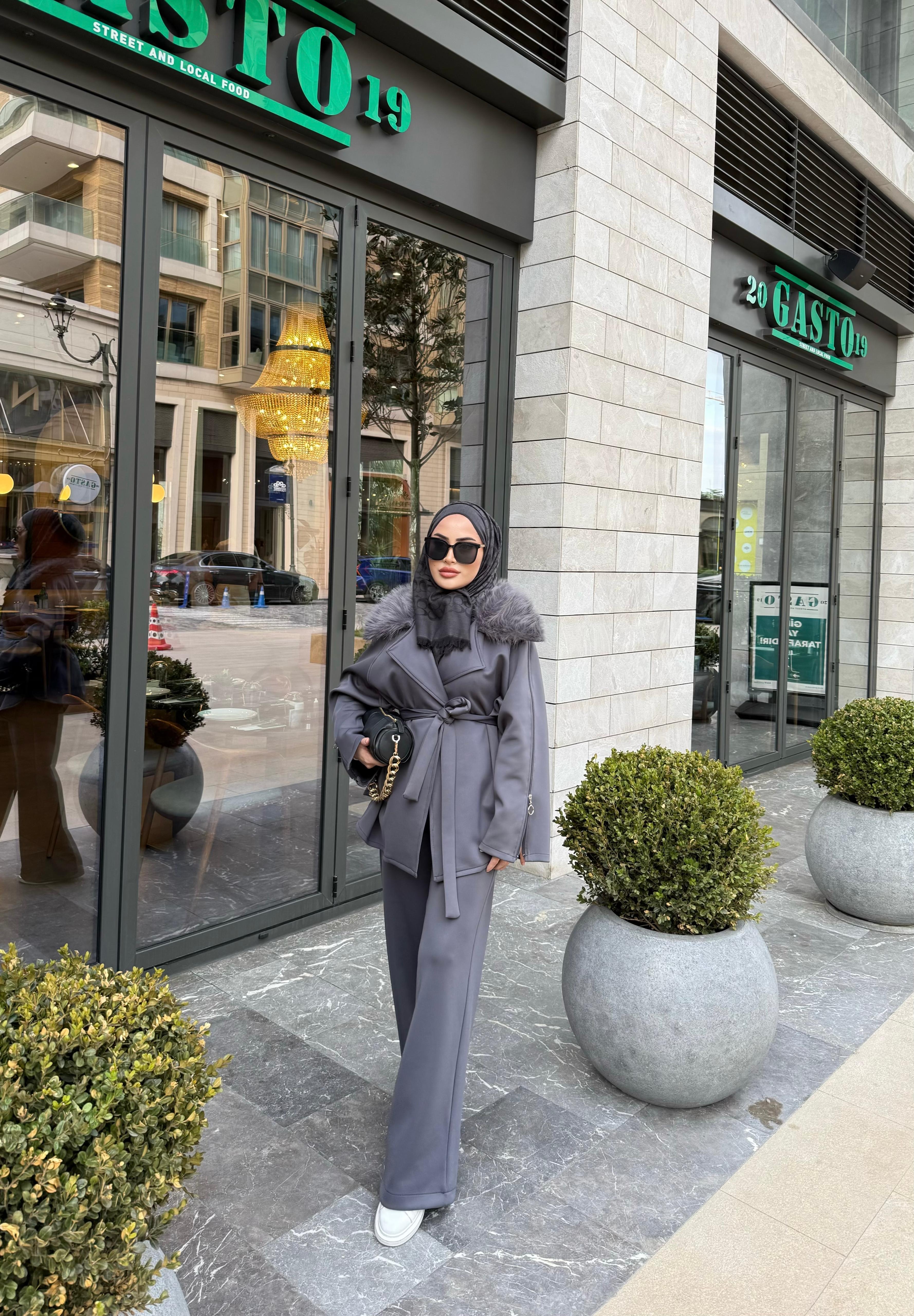TAKM-1759H&R ButikJoan Kürk Detaylı Scuba Takım Gri