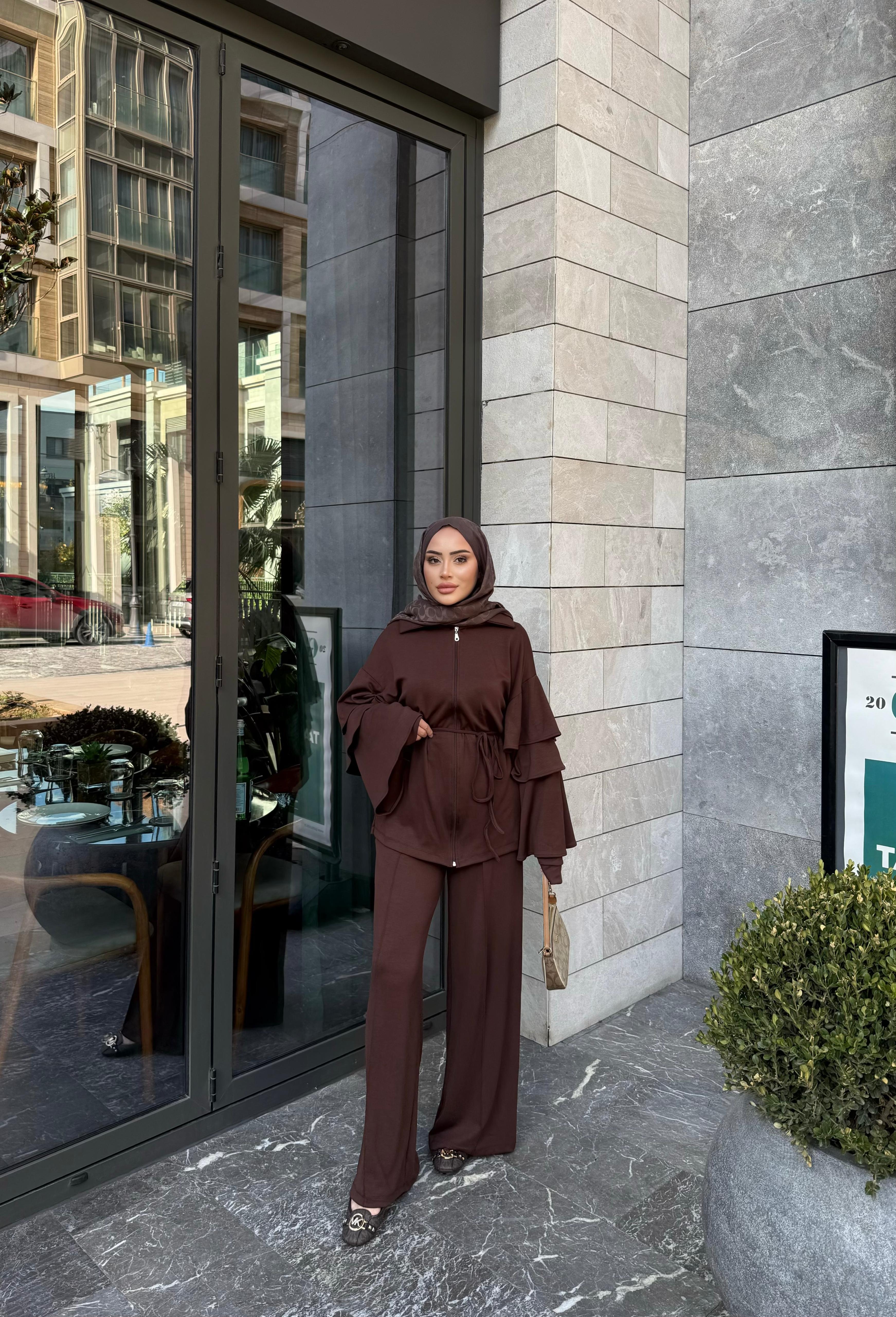TAKM-1778H&R ButikKol Fırfırlı Oysh Takım Kahverengi