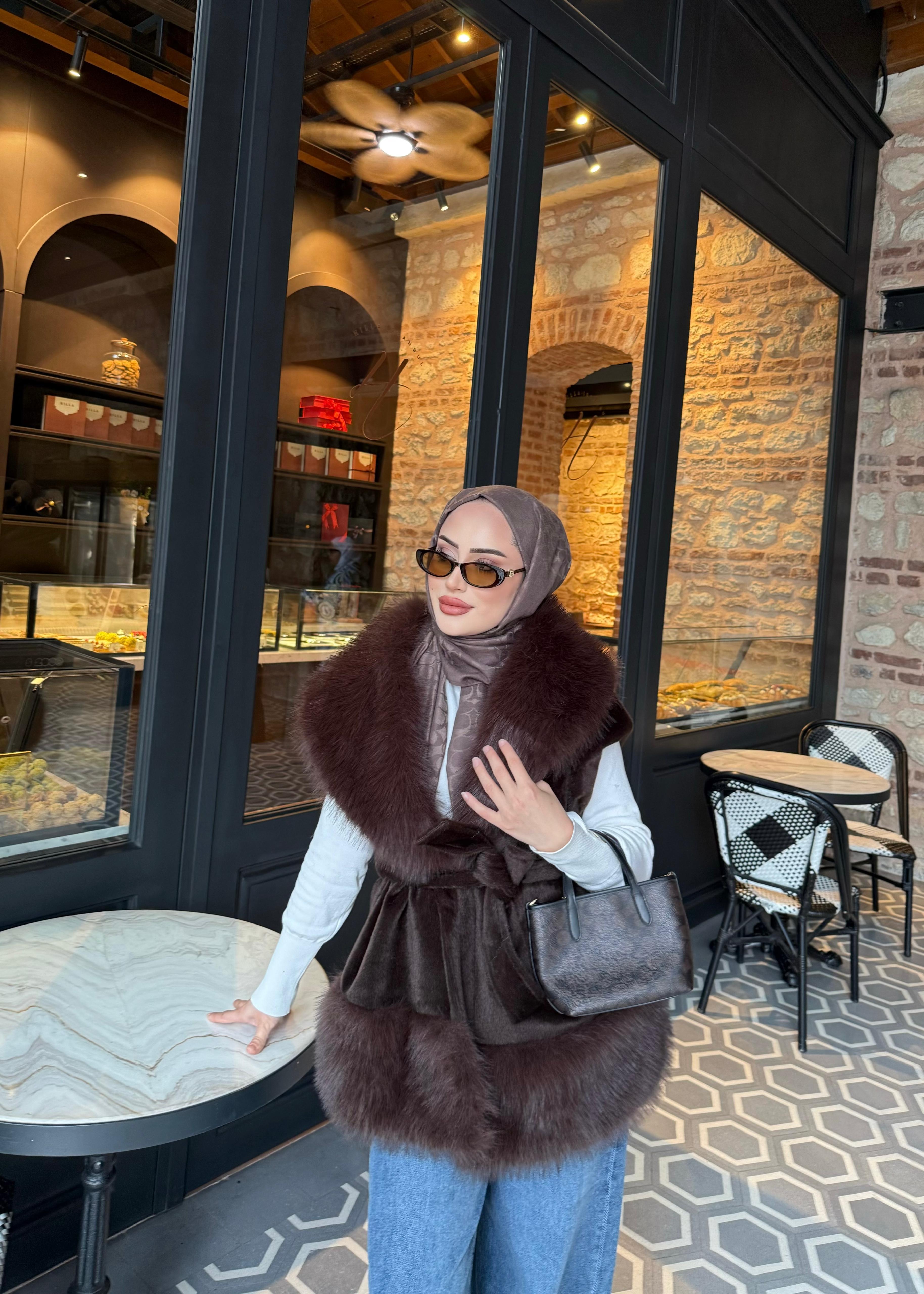YELEK-284H&R ButikLakassa Yaka Ve Alt Kısmı Kürk Detaylı Yelek Acı Kahve