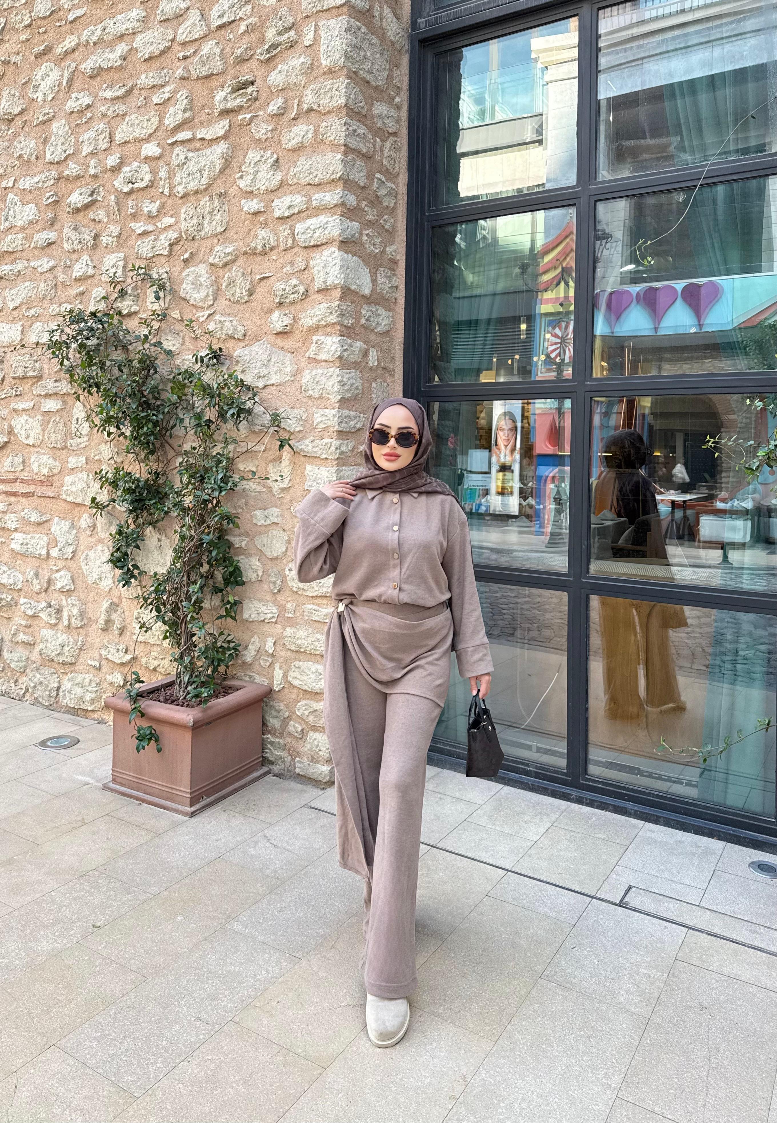 TAKM-1796H&R ButikLew Örme Triko Yan Bağcıklı Takım Vizon