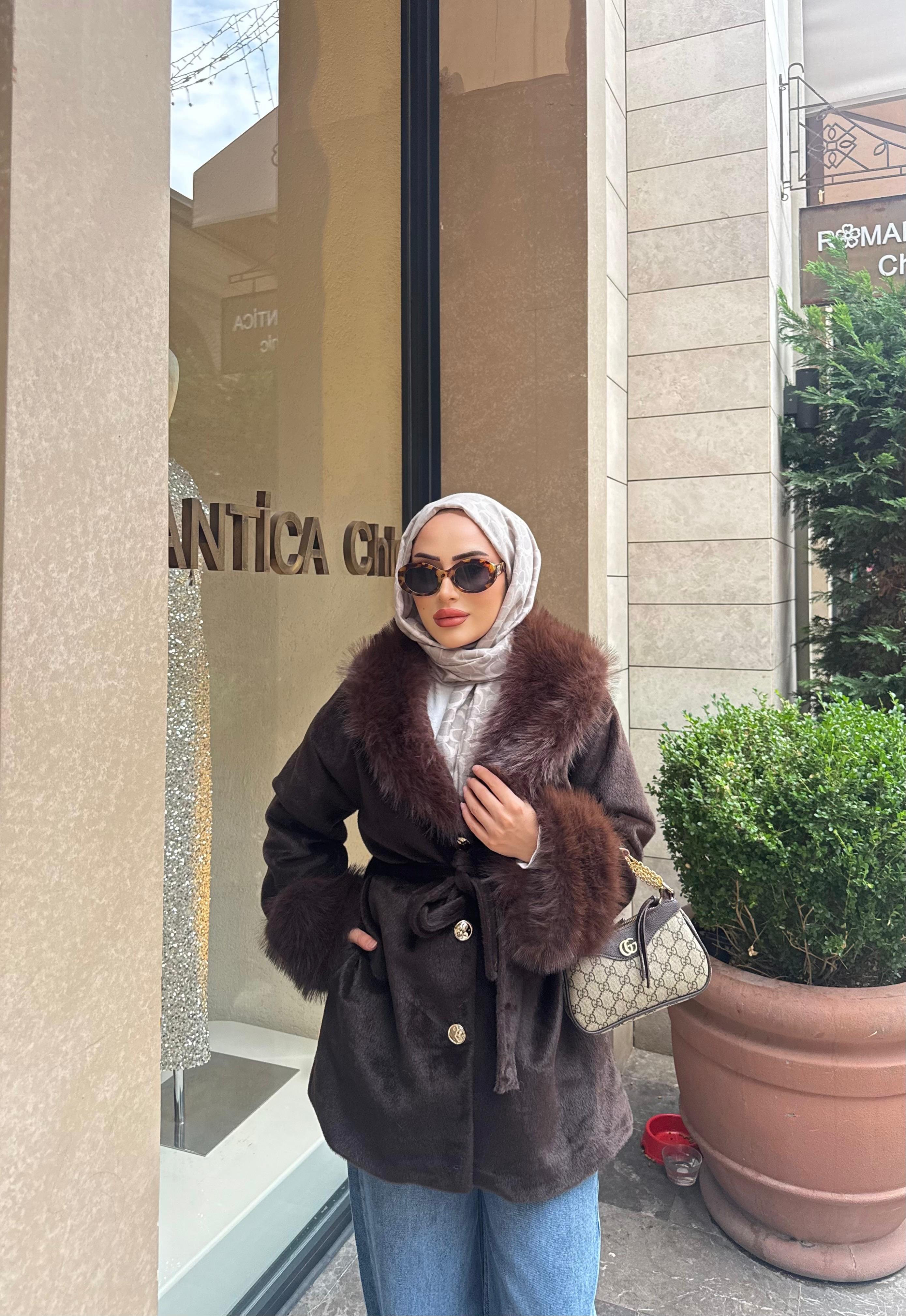 MNT-002H&R ButikMaya Ön Düğmeli Kürk Mont Acı Kahve