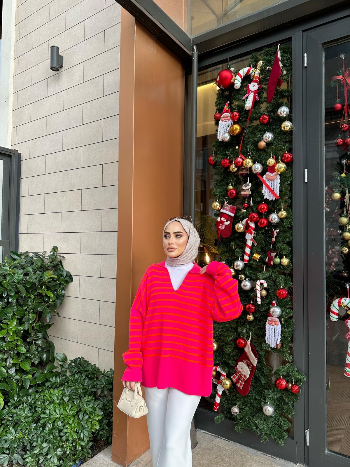 Mini Çizgili V Yaka Triko Kazak Kırmızı