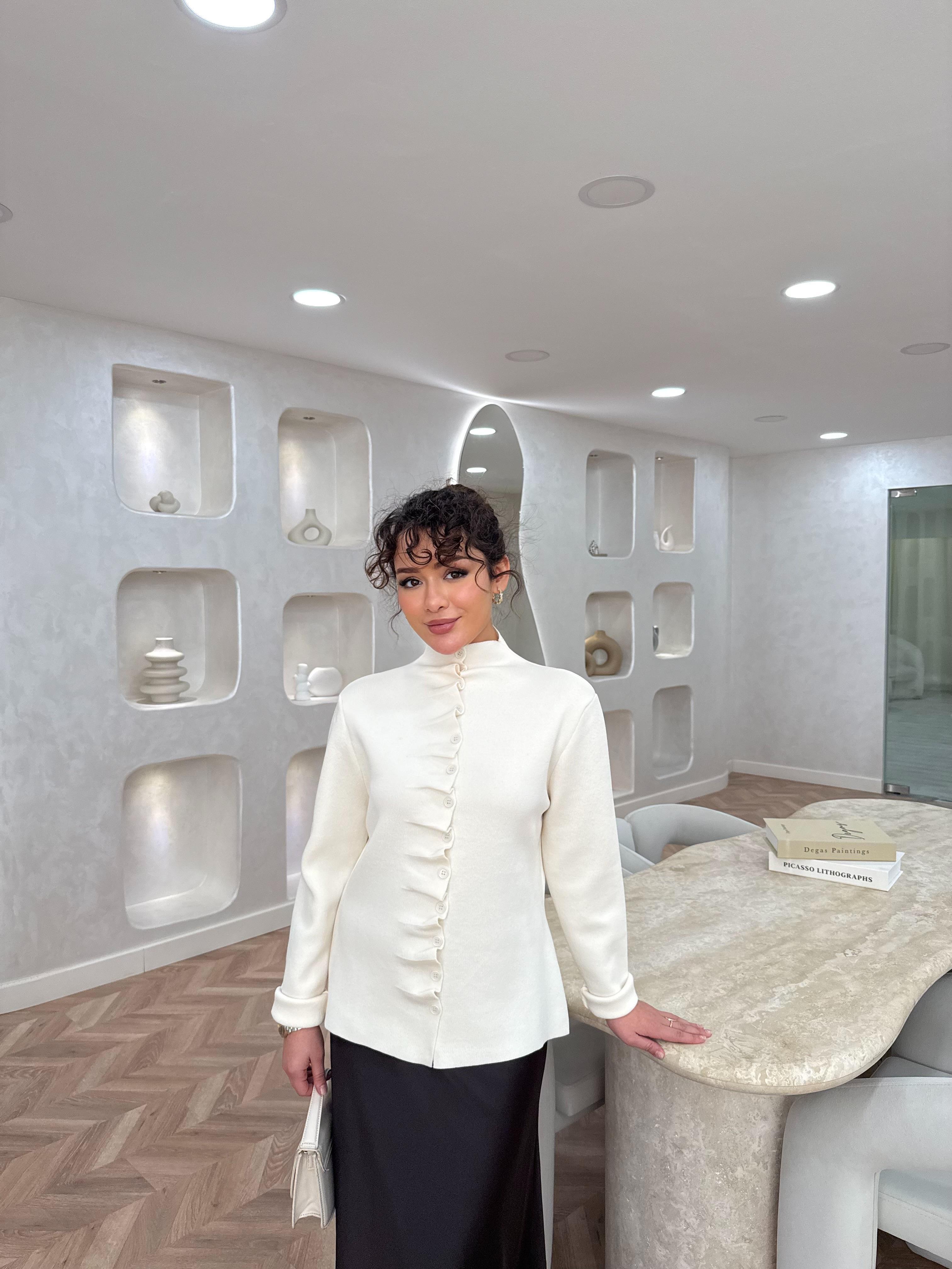 Ön Büzgü Düğmeli Çelik Örme Hırka Ekru
