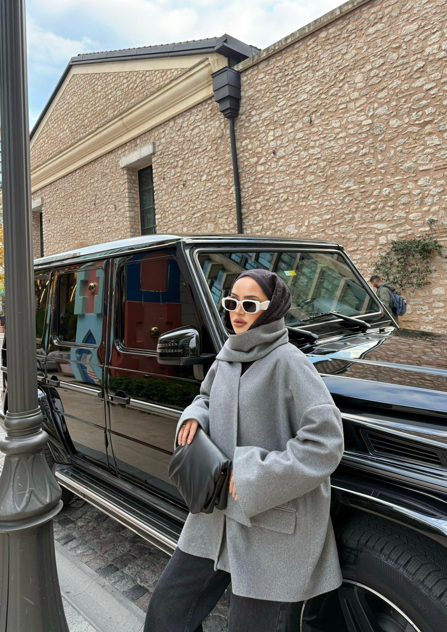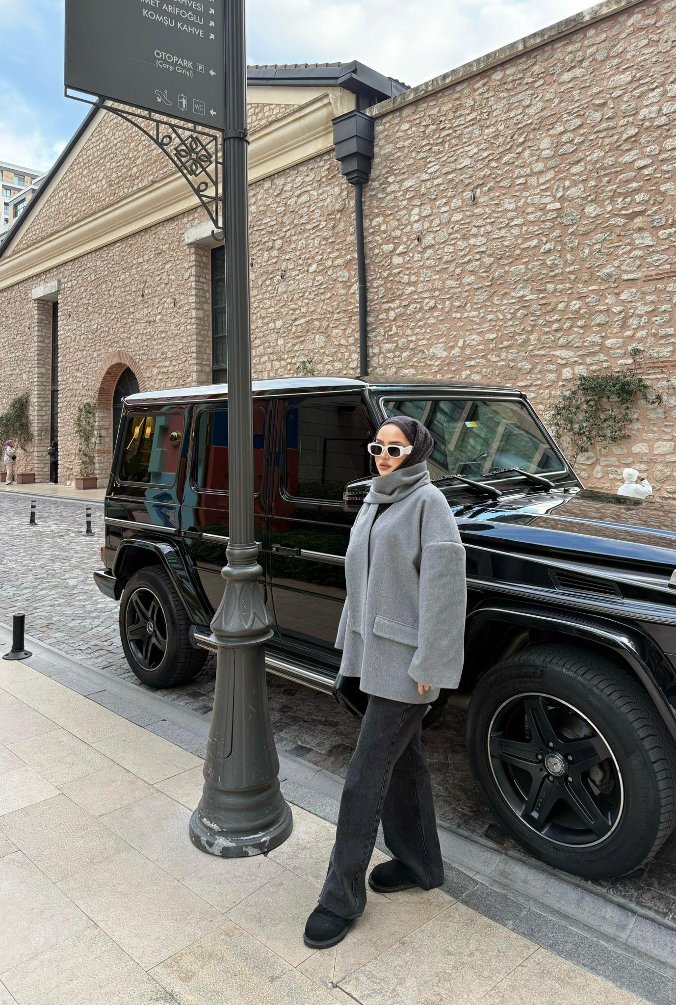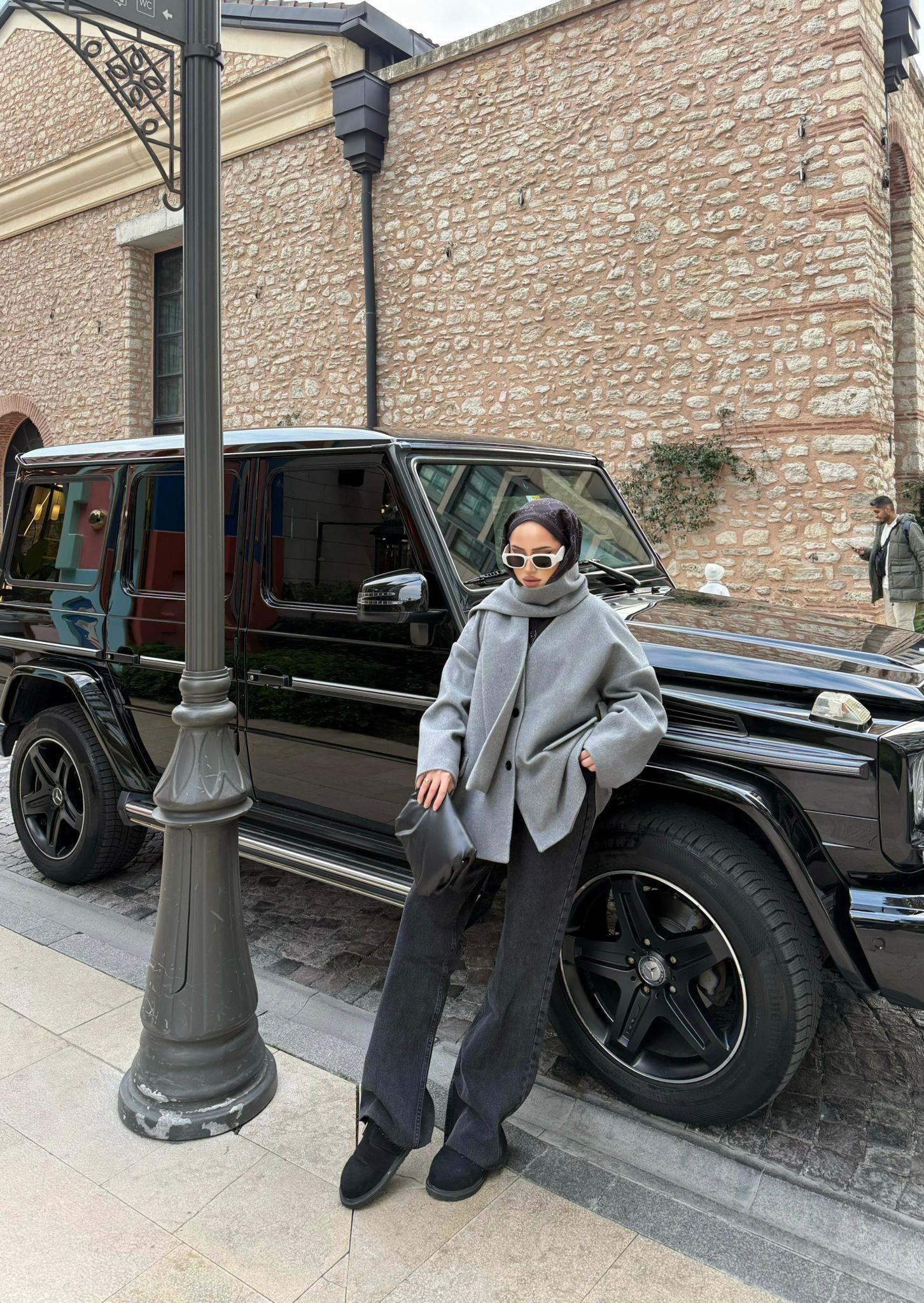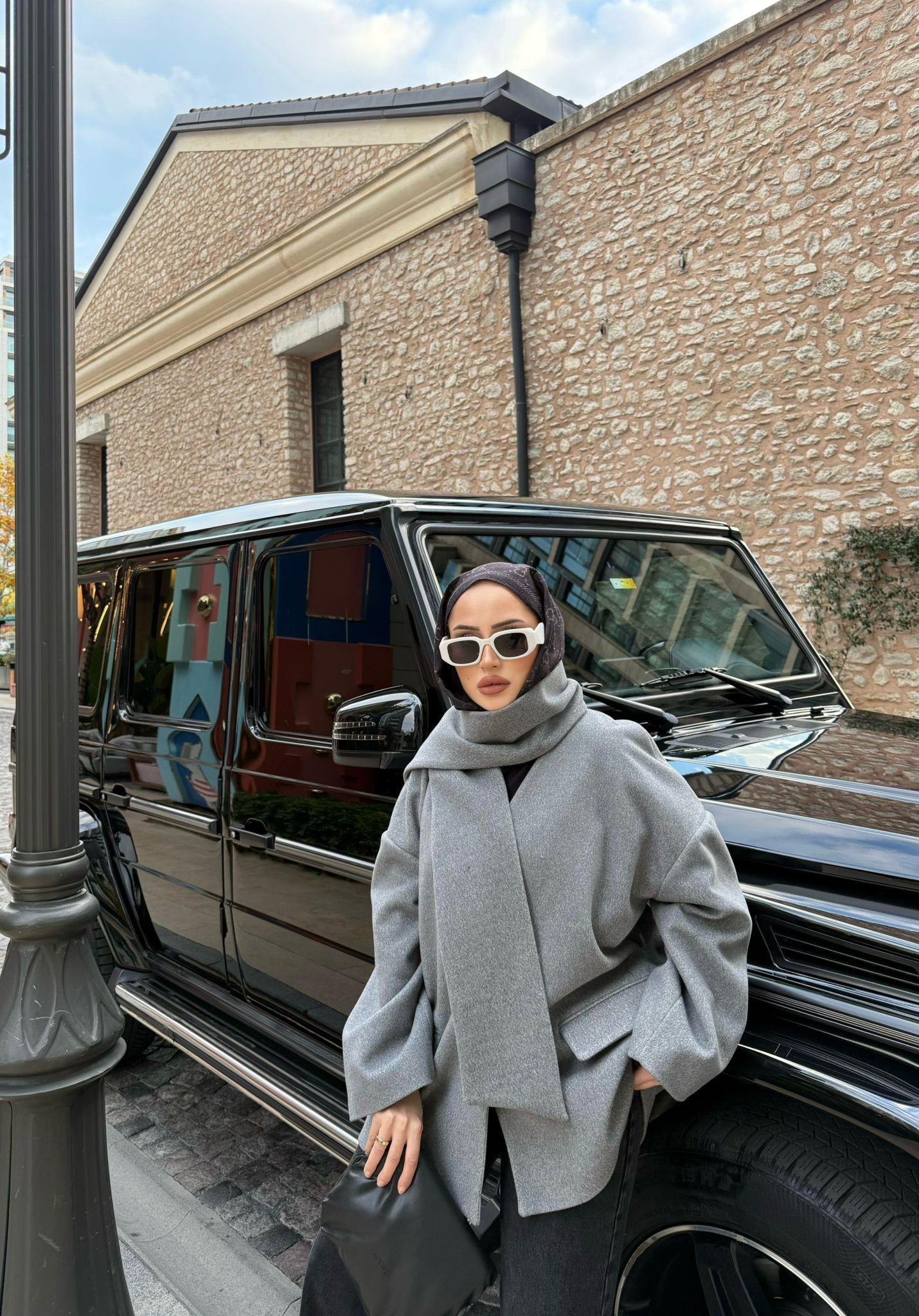 Qula Atkı Detaylı Kaşe Ceket Gri