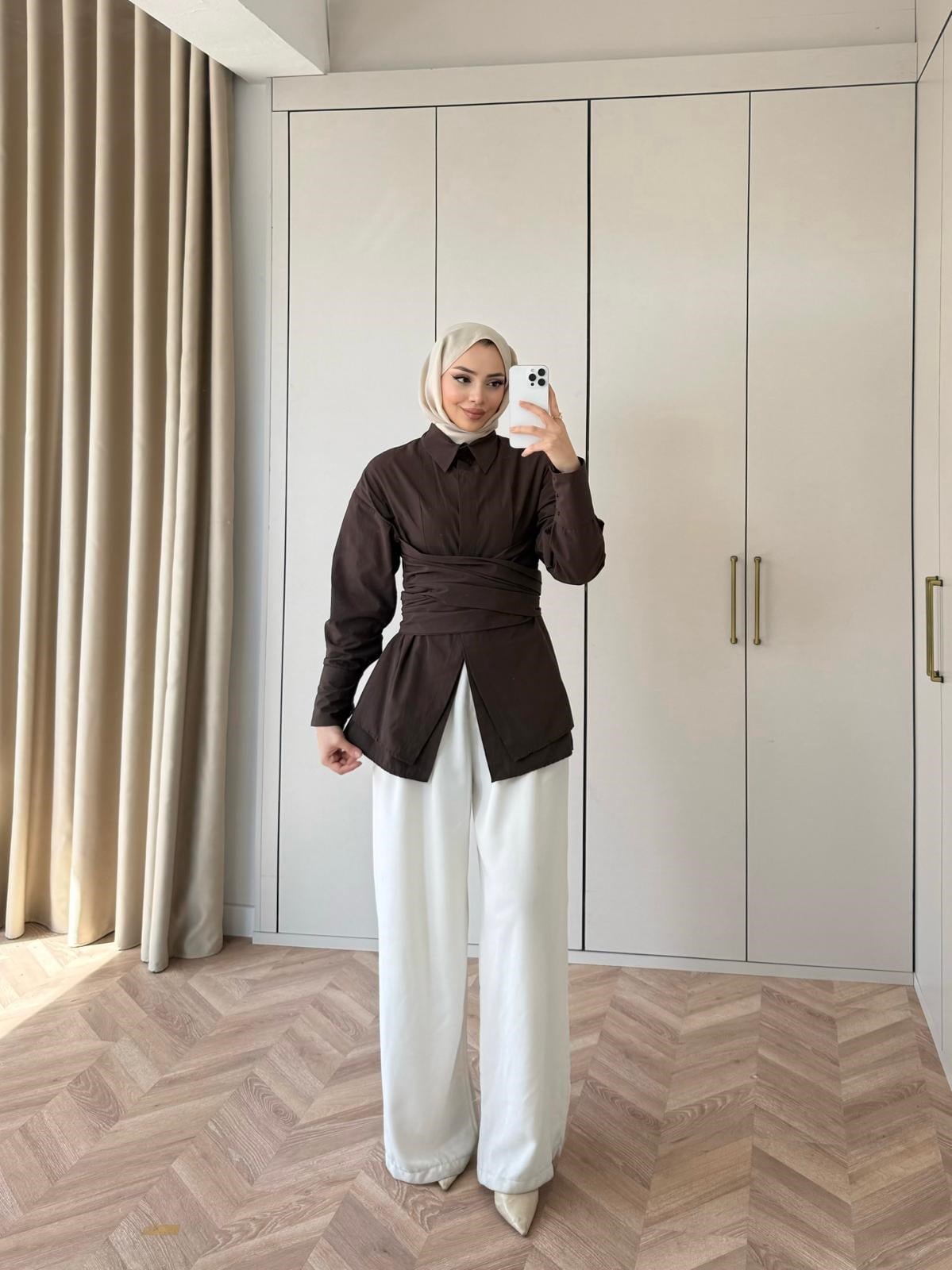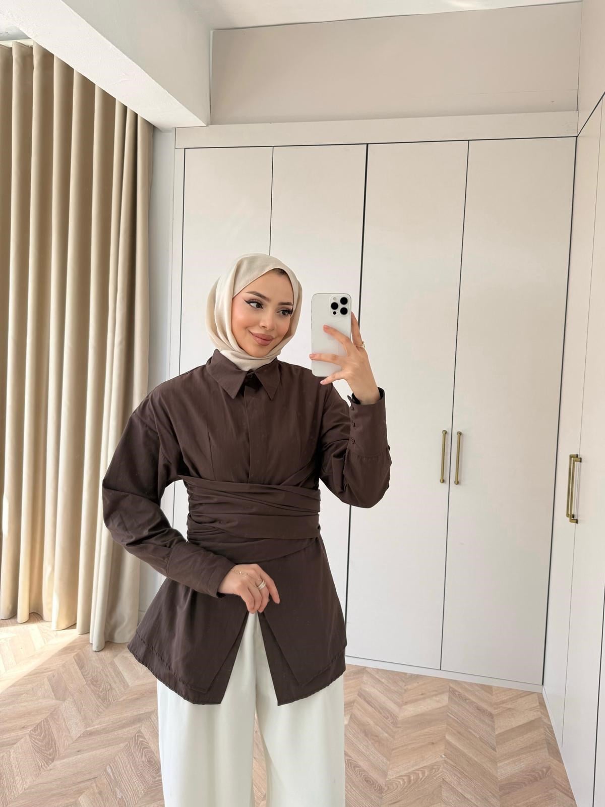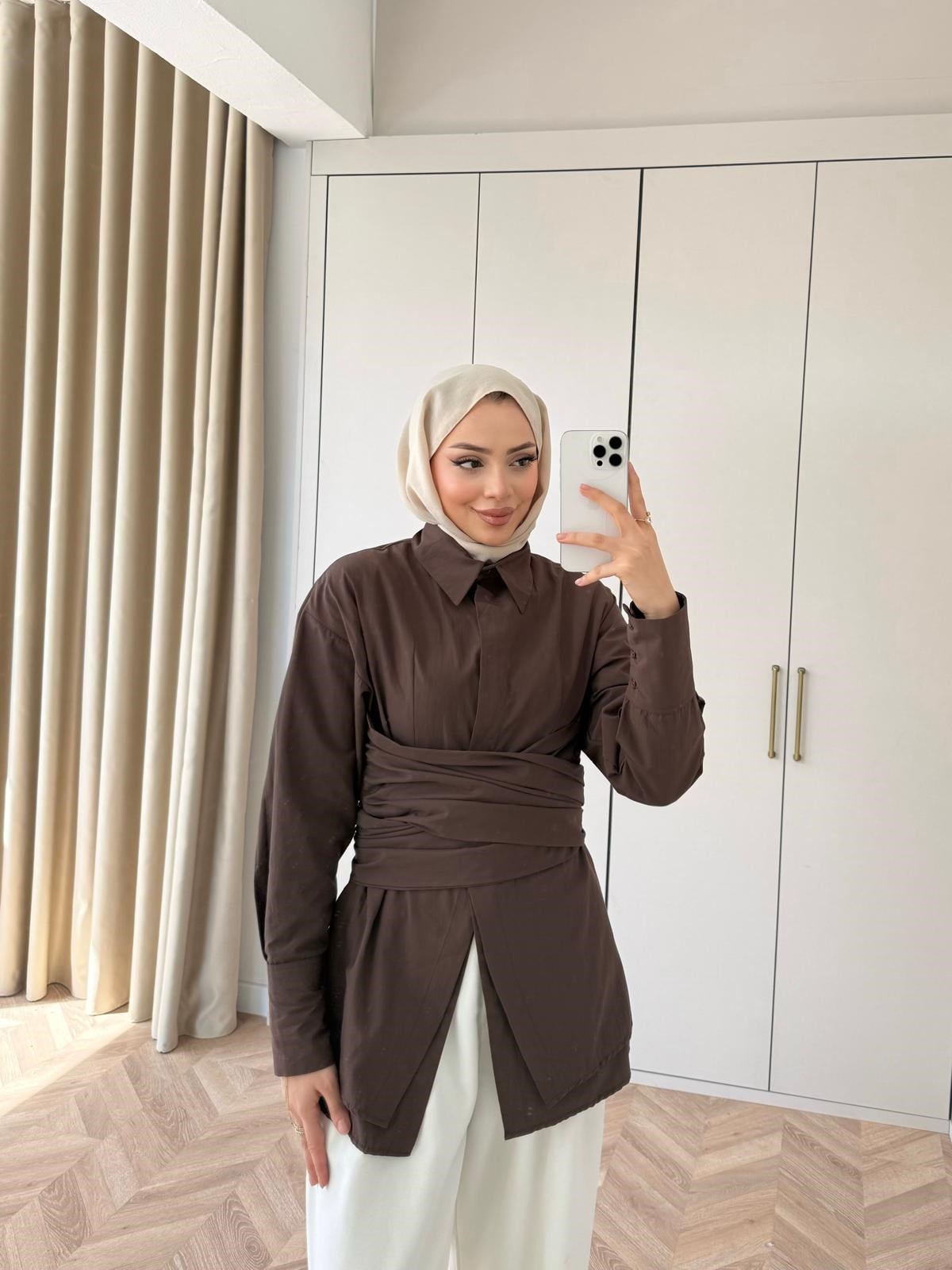 Qus- Eline Bel Bağlamalı Gömlek Acı Kahve